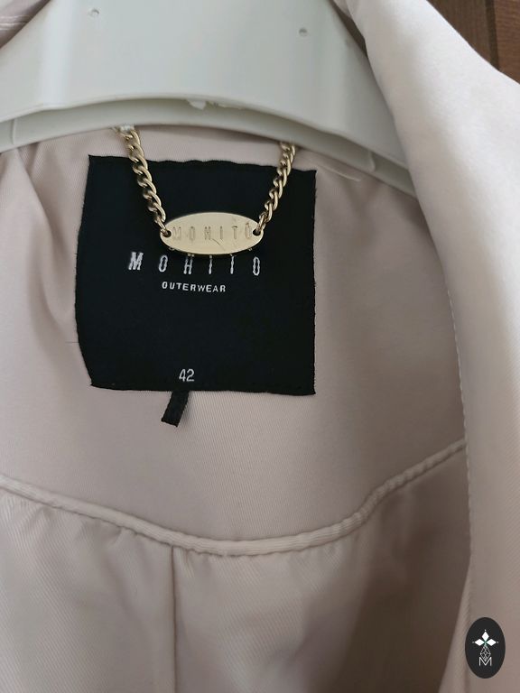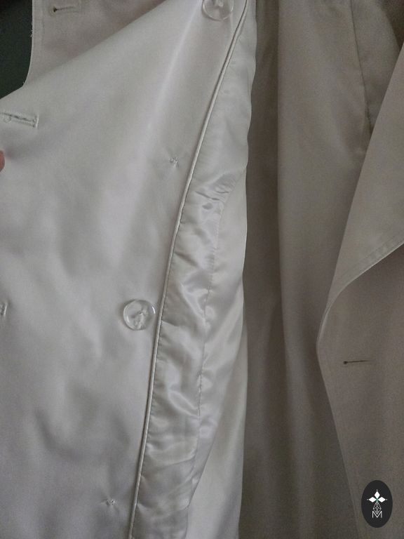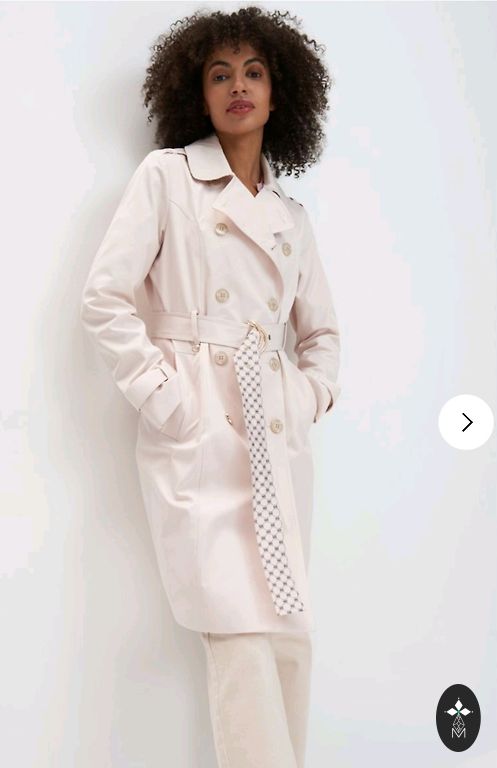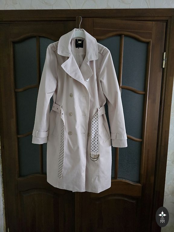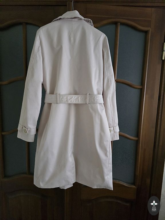 Pienkrāsas trencis, derēs uz 42-44.izm. , nedaudz paplatināts uz leju. Ir pelēki raiba odere, aizmugurē šķēluma vietā paplata ieloce. Mani izmēri ir 102-80-105 cm ir pašā laikā. Jostas nav, var lietot jebkuras krāsas jostu, ja vajag.