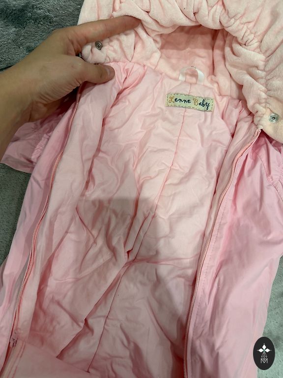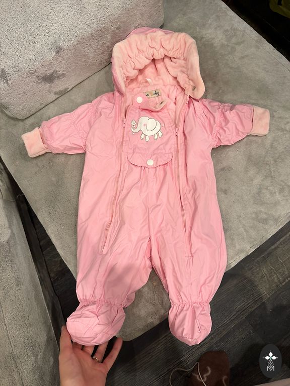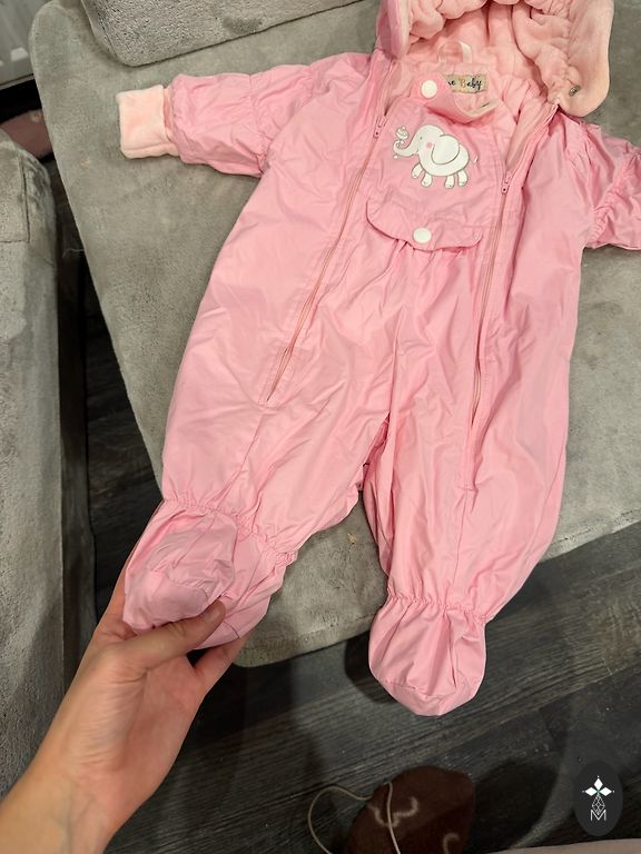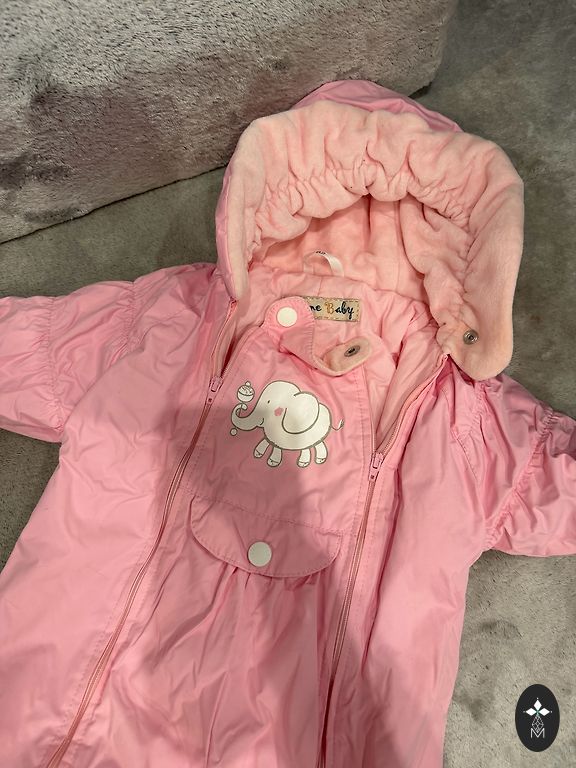 Very soft insulated overall for cold autumn/warm winter. Looks adorable - the fur seems to be made of roses. The color is closest to the last picture. Labeled 9/12 months, but for us, at 74/80 it was already snug, so worn exactly 2 times. Like new. Ideal for 68/74.