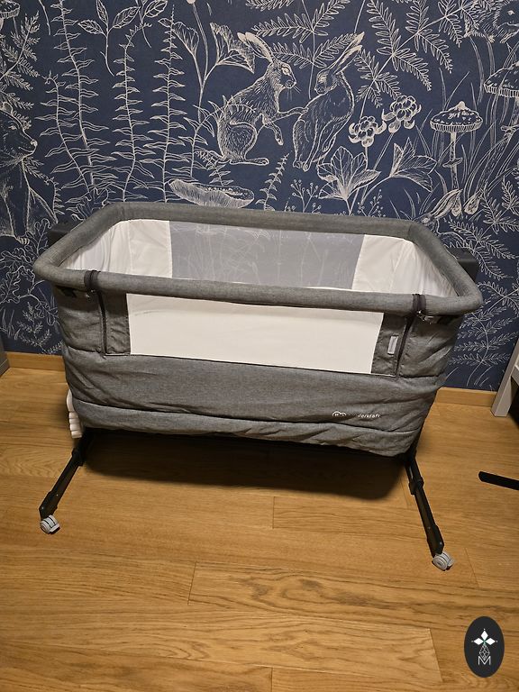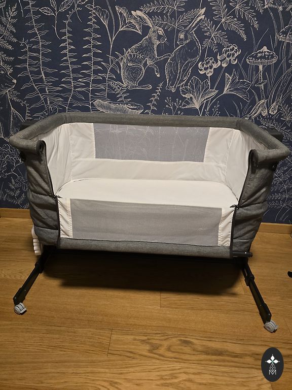 The crib can be used as a single bed, as a baby crib connected to the parent's bed, and as a travel crib. The set includes a mattress, a mattress cover, a fitted sheet, and a travel bag. The crib is very durable. Made of steel, yet stylized in a way that makes the frame look like wood, with mesh walls to ensure air circulation, one side wall is removable. The crib's height is adjustable in 4 positions.
