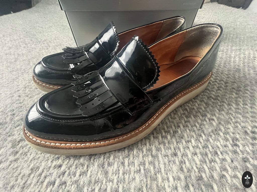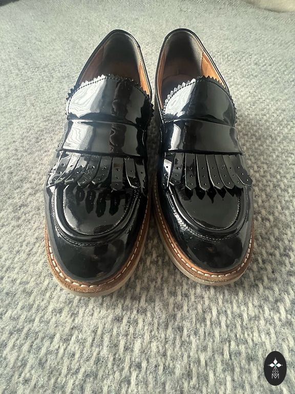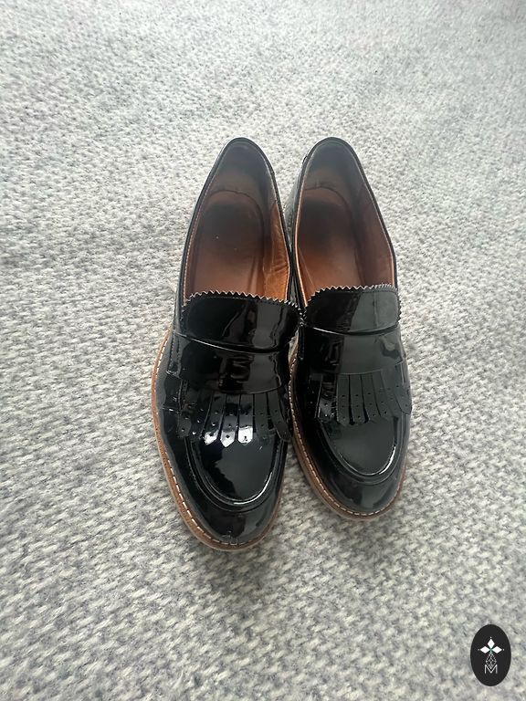 Lloyd ādas apavi. Iekšpusē āda, virspusē lakāda. Defekti redzami bildēs - aizmugurē pie šuves padilusi lakāda, purniņi mazliet apsisti un priekšpusē locījuma vietā ieloces. + sūtīšana