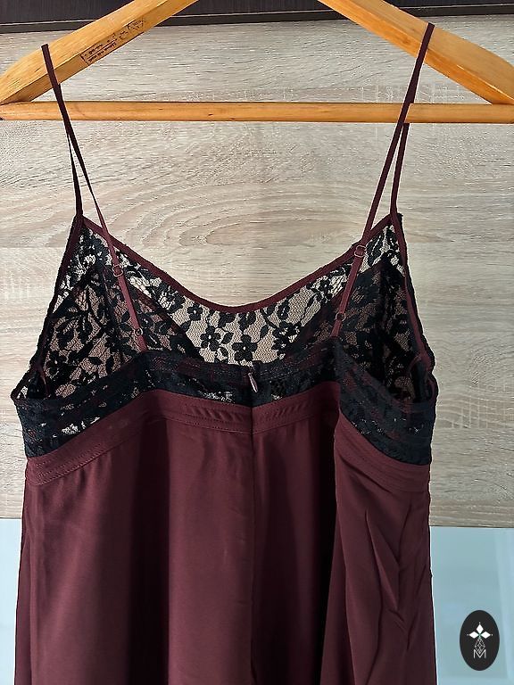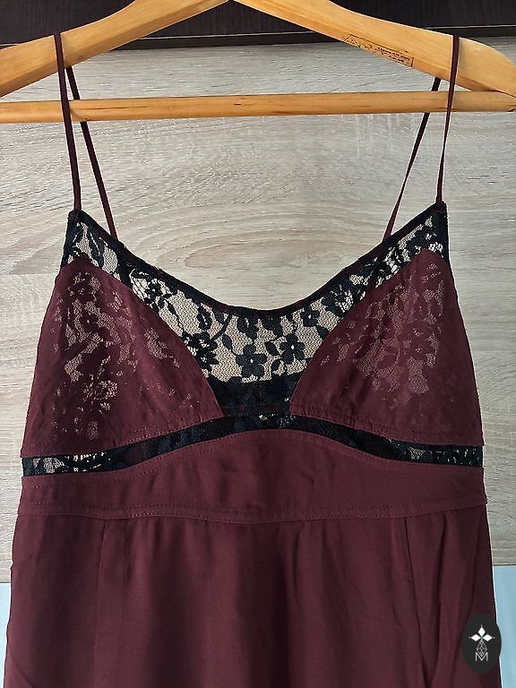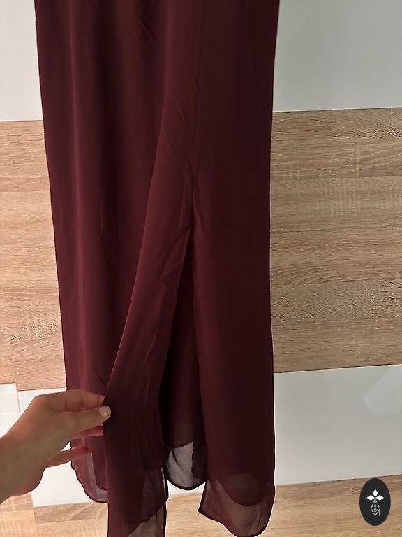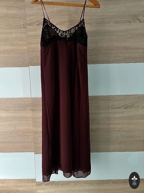 Bordo adīta auduma kleita ar mežģīni apakšdaļā. Bordo ar zelta spīdumiņiem,audums ļoti skaists. Krūtis 40 cm, viduklis 40 cm. Garums no pleca 86 cm. Sūtu