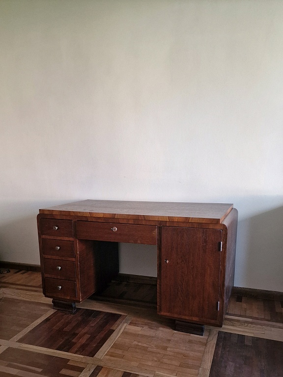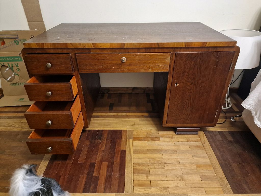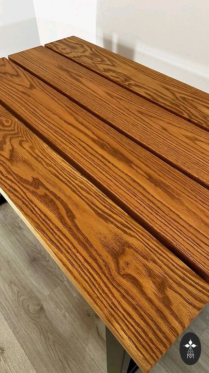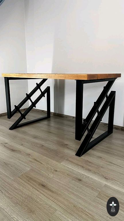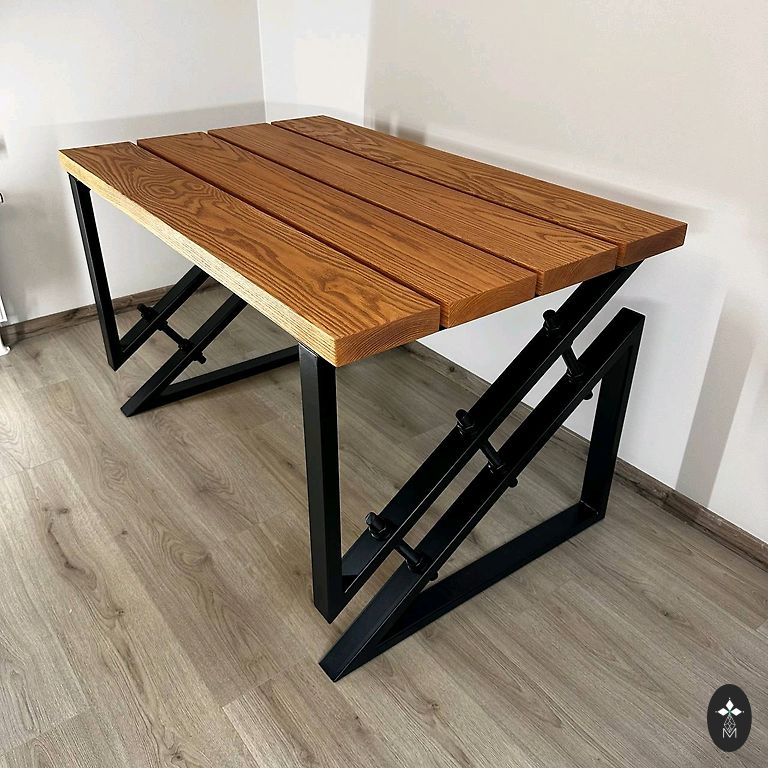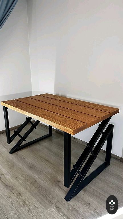 Matmenys: 126 cm ilgis, 73 cm plotis, 76 cm aukštis, paviršiaus storis 4.5 cm. Natūralus medis, gyvos kraštai, naudoti seni lentos, klijuotas, taisytas epoksidu, lakuotas. Metalinės kojos. Galiu padaryti tokį pat arba kitokį.