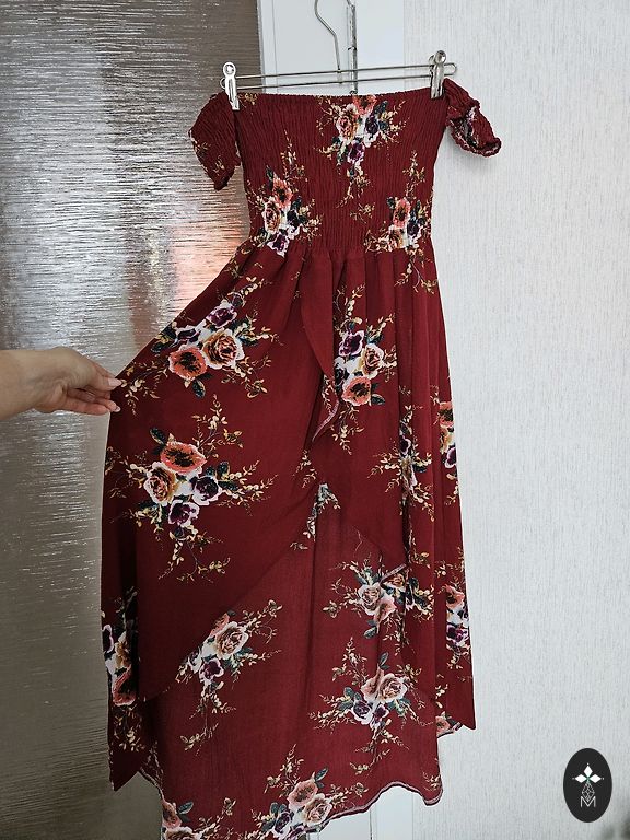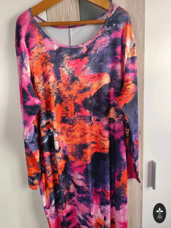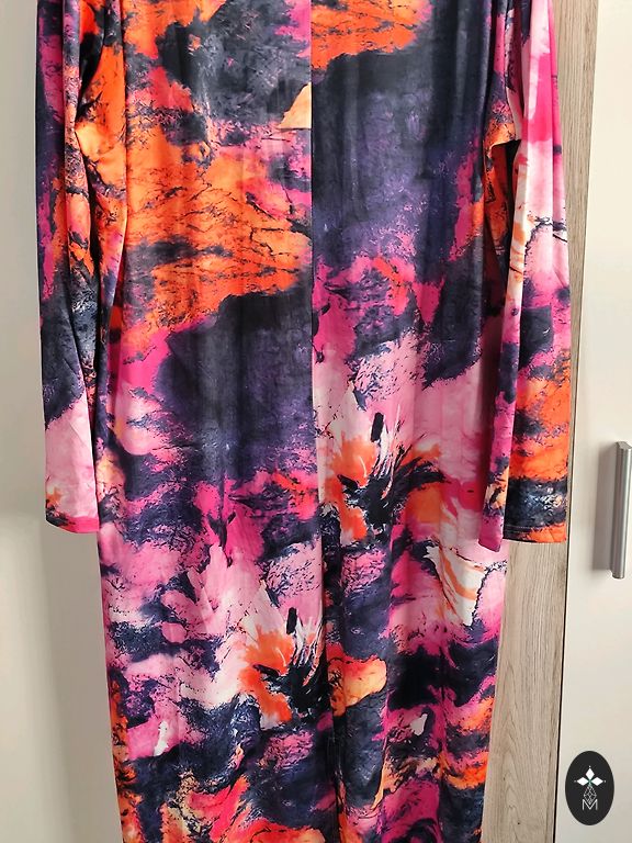 M/L izmērs, oversize, ir kabatas. Garums 120 cm, krūtīs 120 cm, viduklis 120 cm, gurnos 130 cm, piedurknes garums 65 cm.