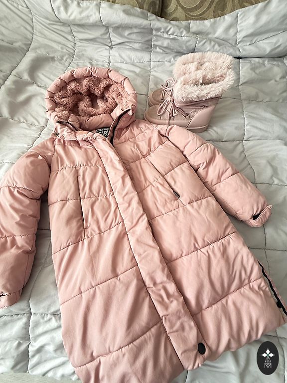 Ziemas kurtka ļoti labā stāvoklī silta, pagarināta, dibenu nosedz, abās sānu malās regulējas ar spiedpogām. Aizmugurē iešūts atstarotājs. Ziema bija silta mēs praktiski nenēsājām, tagad jau maza.