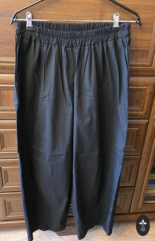 Pārdodu jaunas, samtīga materiāla brīvā laika bikses uz UK14 (EU42) izmēru- vidus 42 ar šņorīti regulēms, garums 106, iekšstara 77.5, gurnos 57, staras platums 23, audums: 92% poliesters, 8% elastāns.