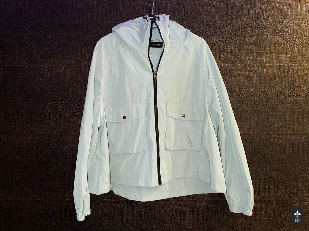 Very light blue trench coat for a tall figure. The blue is more beautiful in real life. Size 24. More reminiscent of a summer/spring coat. Not a typical trench coat fabric, but more like a jacket. Good lining, slits on the sides, only 2 buttons for closure, no pockets, shoulder pads.