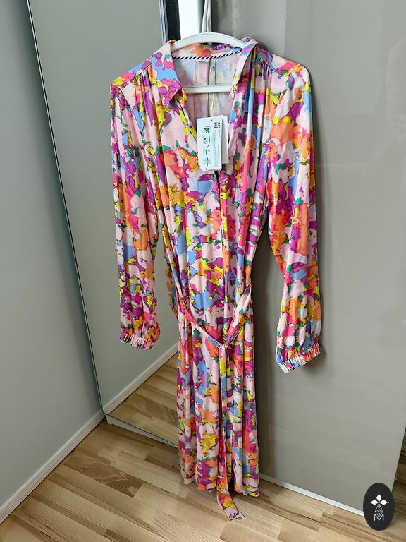 Sildil on kirjas S/M suurus, kuid sobib ka M/L suurusele. Kaenlaaugust kaenlaauguni – 60 cm, pikkus – 103 cm. Keti rihm on komplektis kaasas.