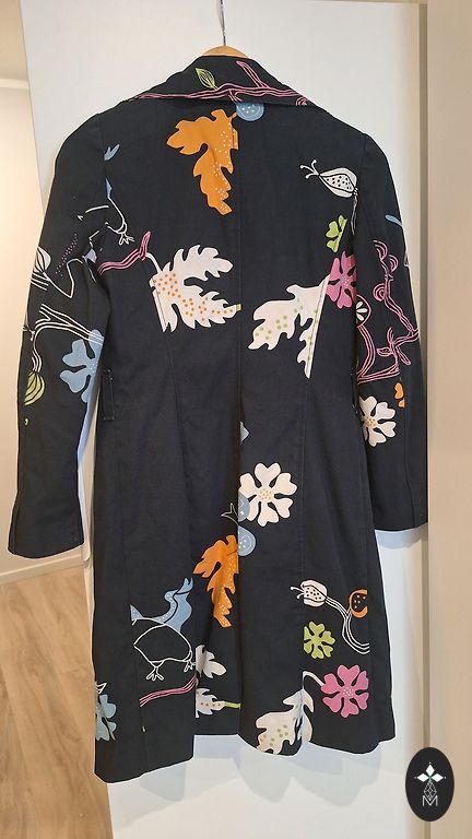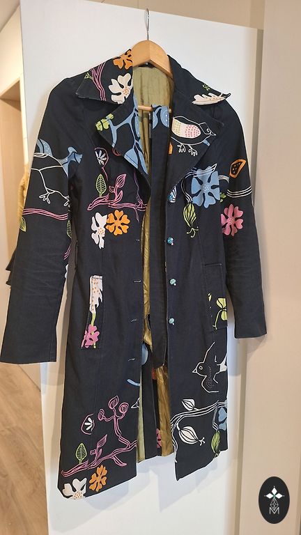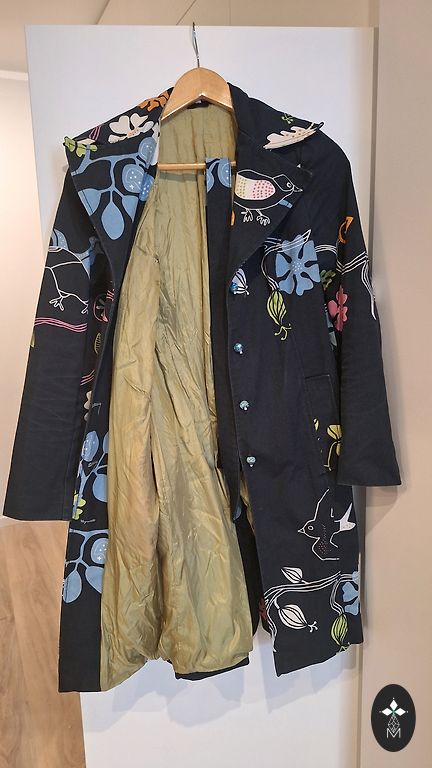 60% kokvilna, 36% poliesters, 4% akrils. Rudens mētelis ar ērtu kapuci. Krūtīs 120cm., viduklis 126cm., gurnos 130cm., garums 117 cm