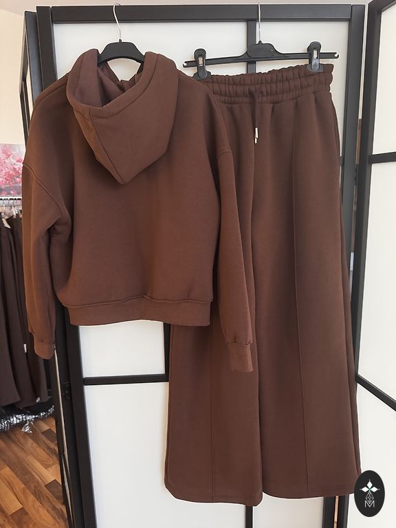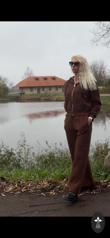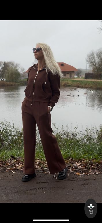 Treniņtērpa komplekts ne reizi nav vilkts, bet birka nogriezta. Bikses ar platajiem galiem un džemperis. Izmēra birkas nav, bet bildē uzvilkts uz L izmēra augumu.