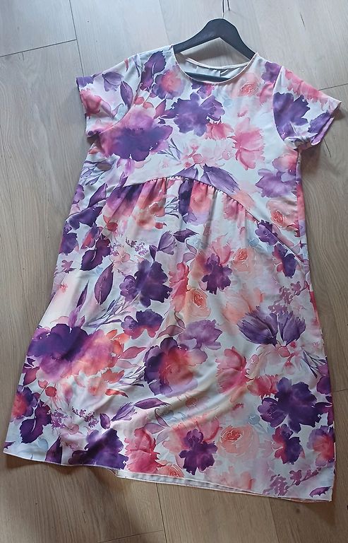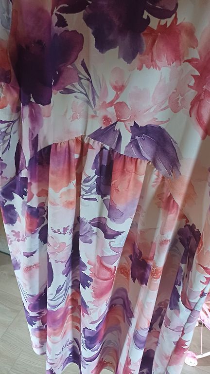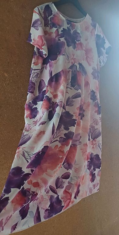 Išmatavimai (cm)- krūtinė 53x2, liemuo 47x2, klubai 55x3, ilgis 100, pečiai 40.Medžiaga nesuminkštinta, ne plona, gali būti medvilninis trikotažas su elastanu. Pagaminta Turkijoje. Midi suknelė su pusilgėmis petnešėlėmis, trumpais apvaliomis iškirptėmis apačioje, taip pat ir rankų galuose. Nugaroje užsegama užtrauktuku.