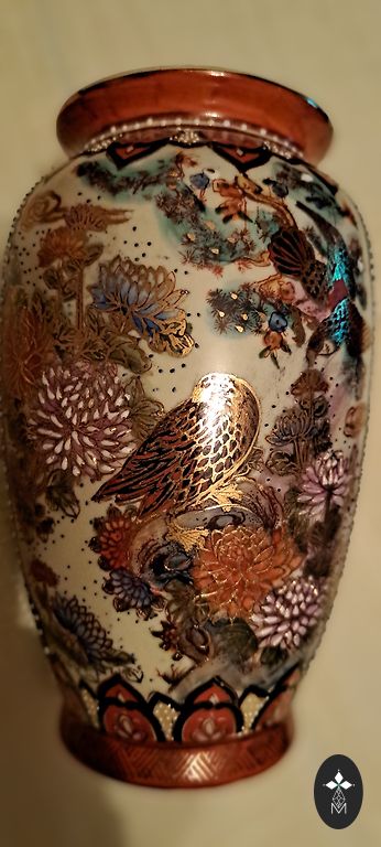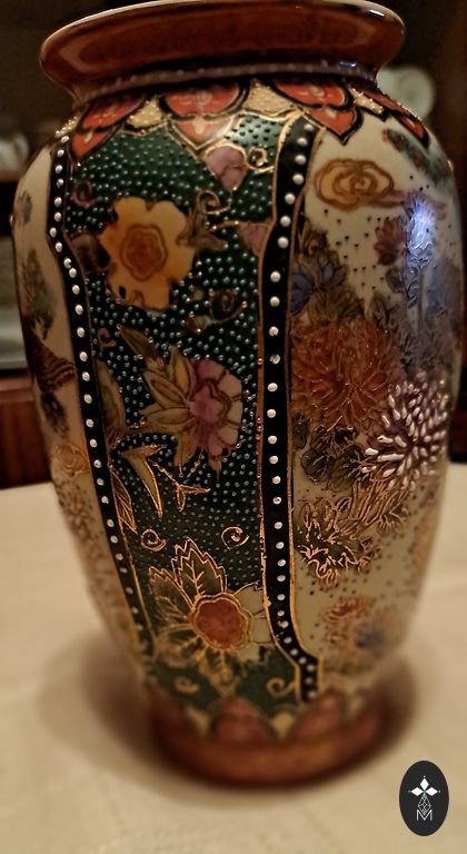 Neliela brūngana stikla vāzīte ar reljefu. Iekšā ir nogulsnes, kuras jāizmazā. Augstums 15.5 cm. Augšas diametrs ap 4 cm.