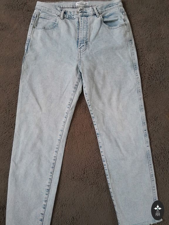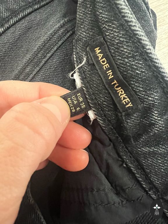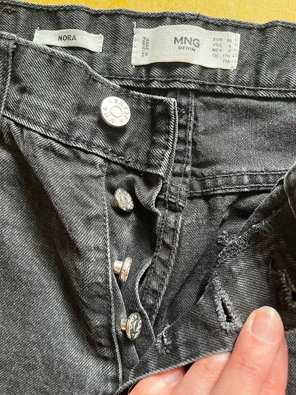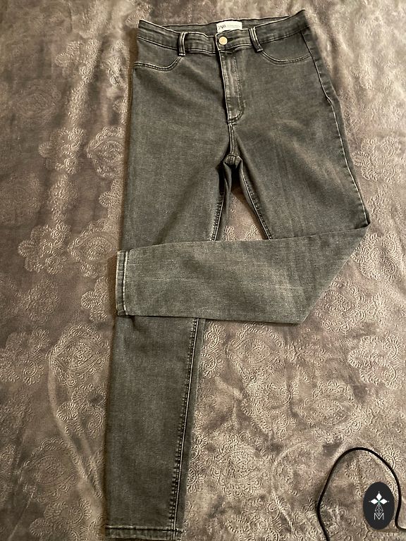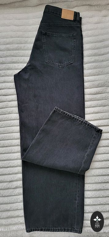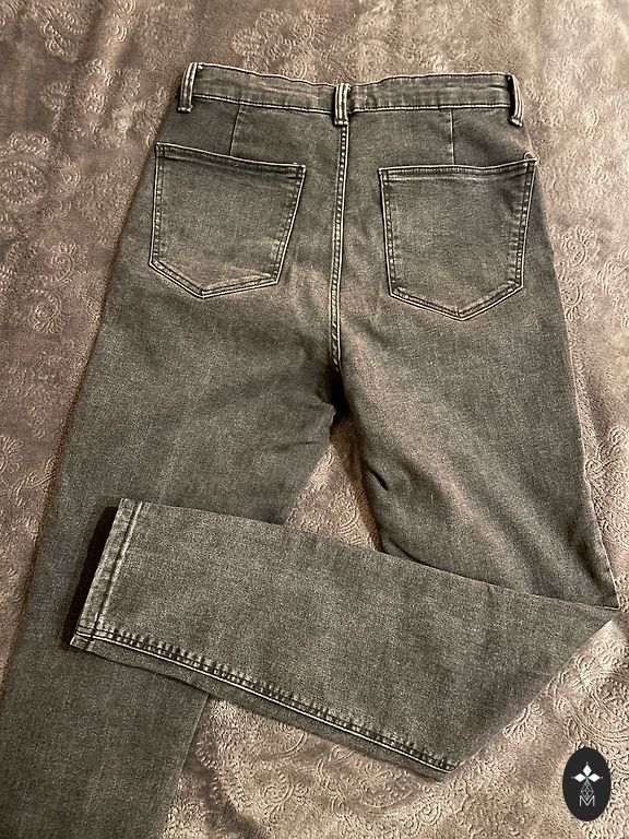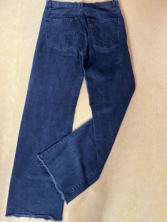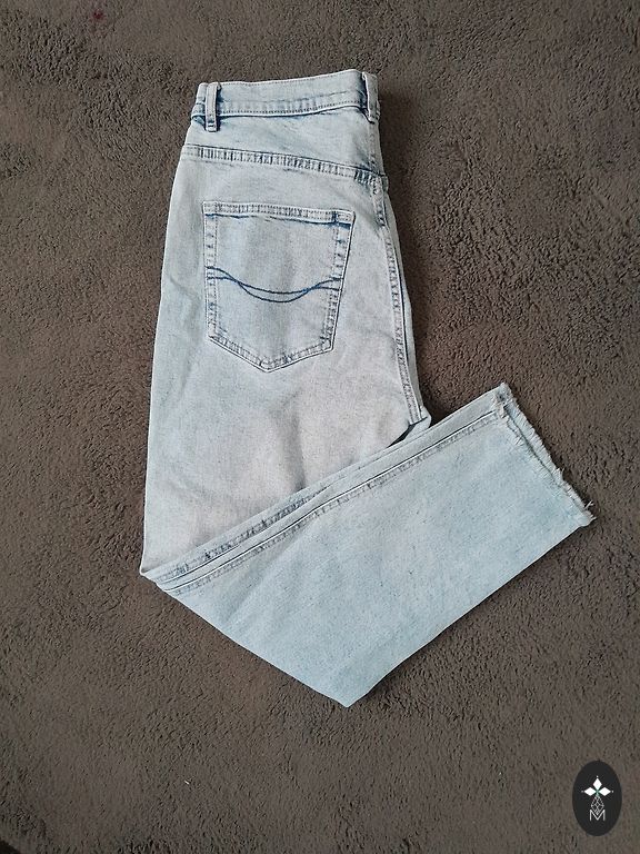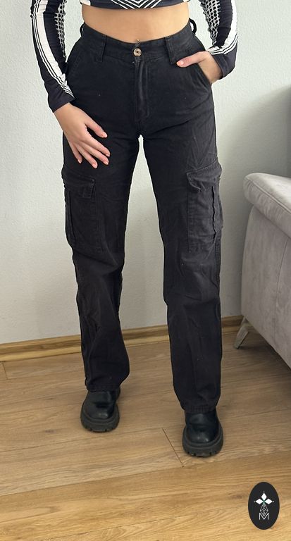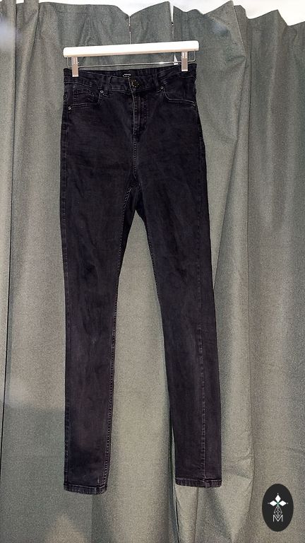 Garums 102 cm, iekšstara 75 cm, jostasvietā 46 cm. Zema jostasvieta. Elastīgas