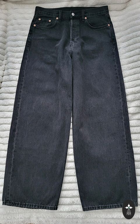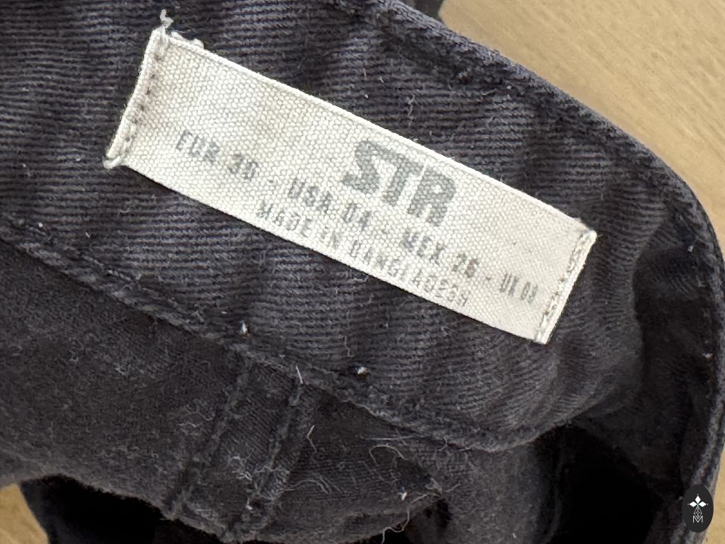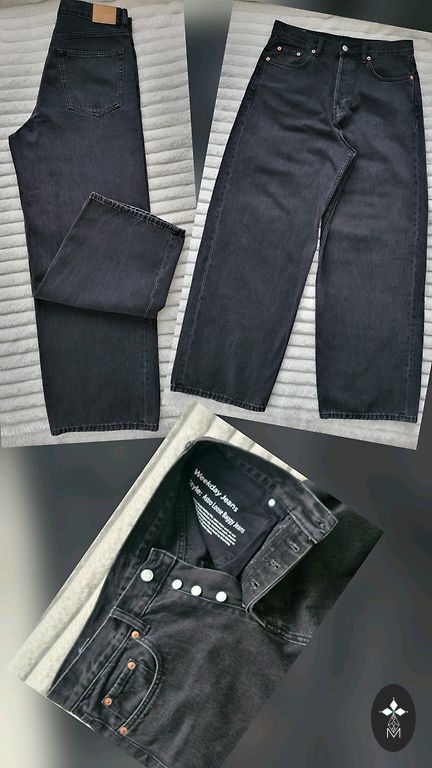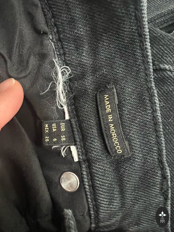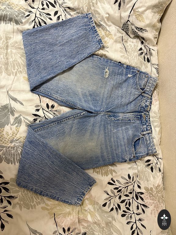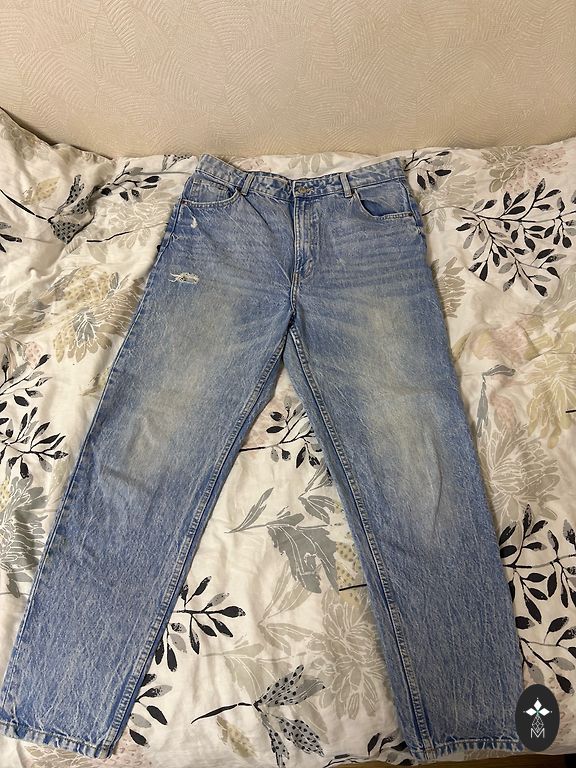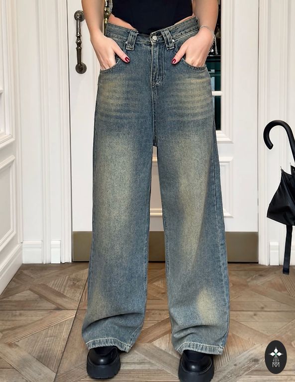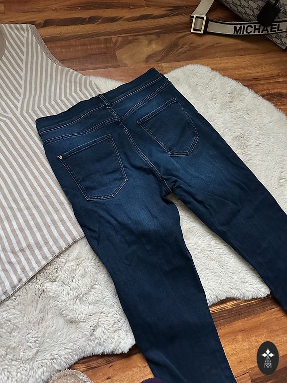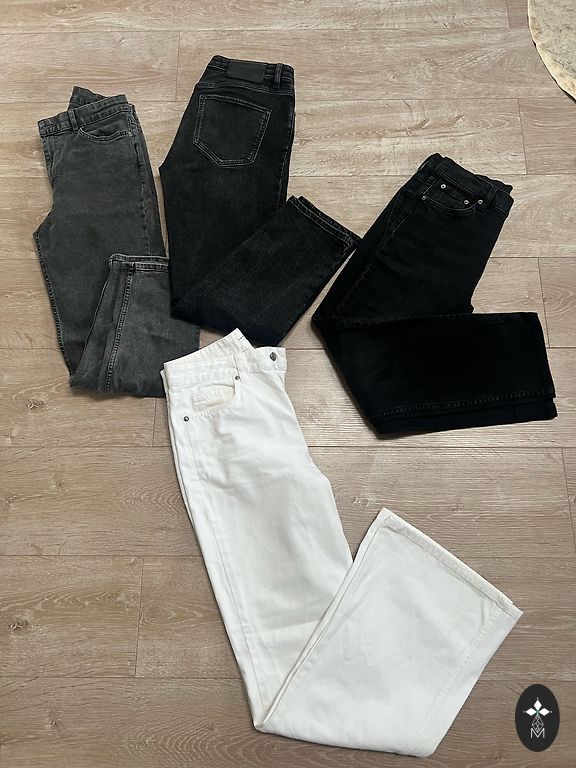 Garums 102 cm, iekšstara 75 cm, jostasvietā 46 cm. Zema jostasvieta. Elastīgas