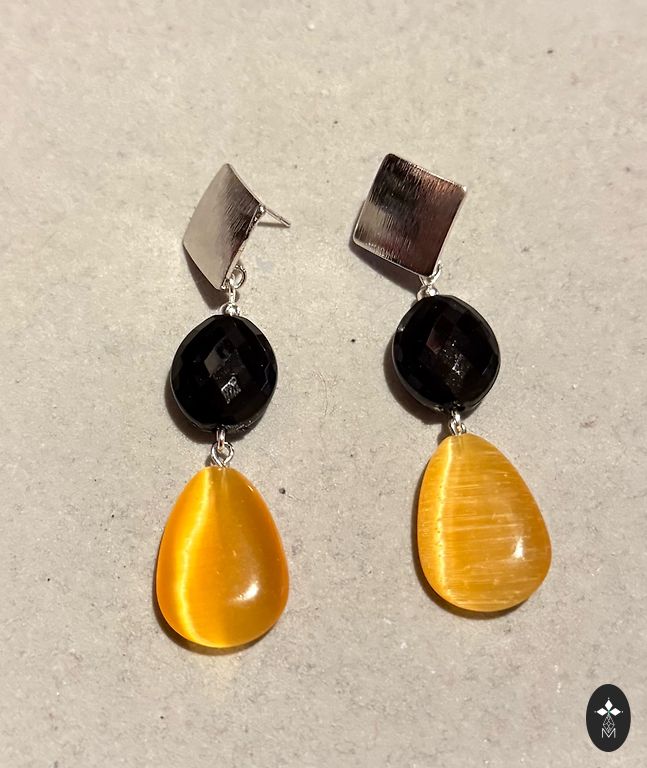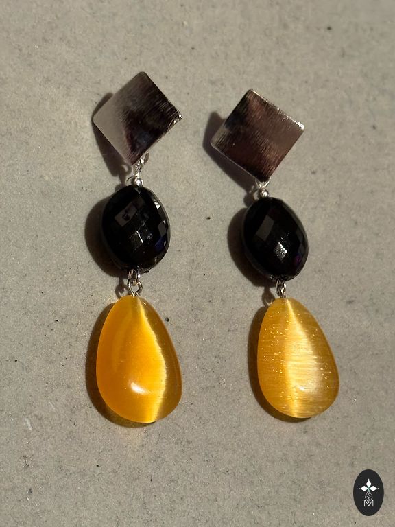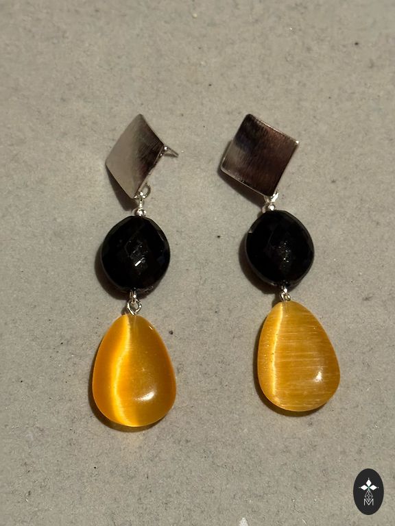 Matēts melns dzintars (tā saucama "cirtne", bēt dzintara, nevulkāniskā.. dažas melnas bumbiņas bordo krāsā lāsmojošas) + caurspīdīga gaiši dzeltena dzintara bumbiņa ar dzirkstelēm + balta dzintara bumbiņa ar diviem sārgiem no brūnīgi melnķiršu dzintara.