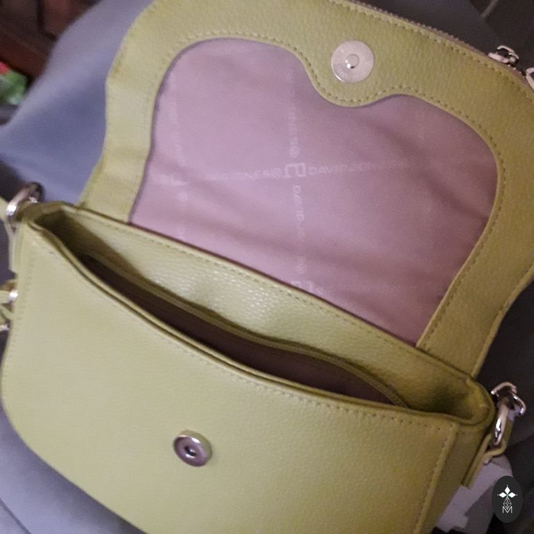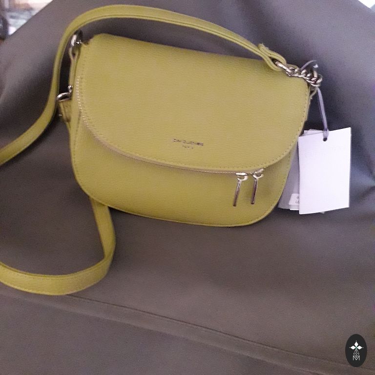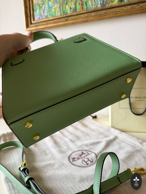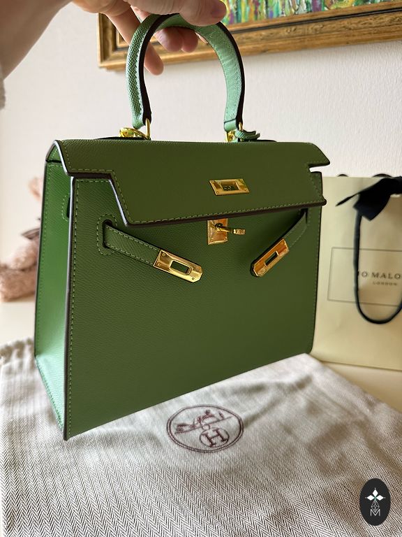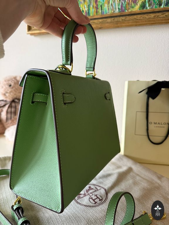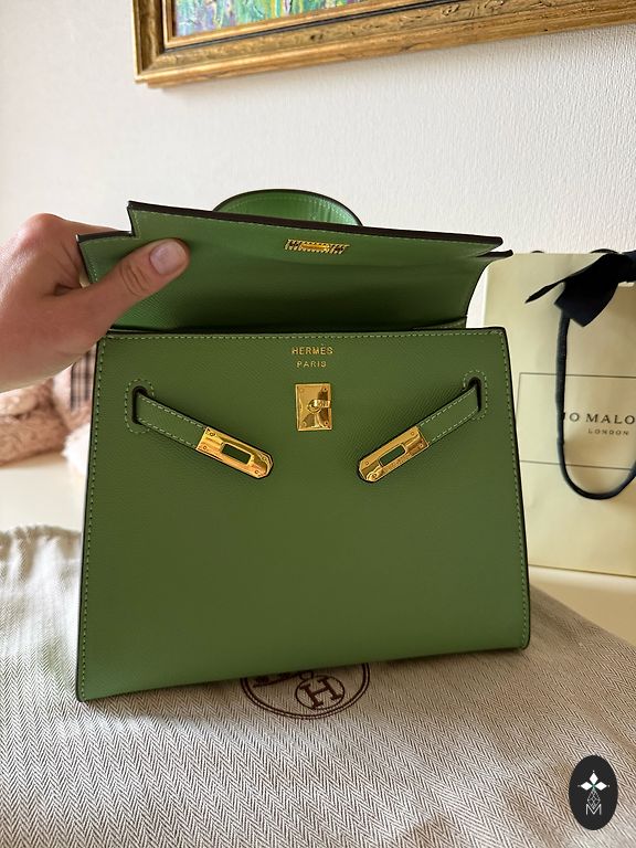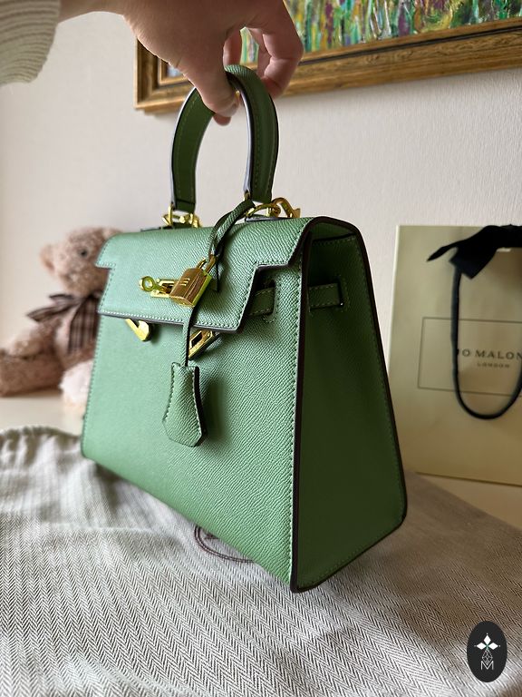 Nėrimo technika pagaminta rankinė su pamušalu, smaragdo žalios spalvos, nerti iš tkrekla siūlų. Rankinės skersmuo ~25 cm.