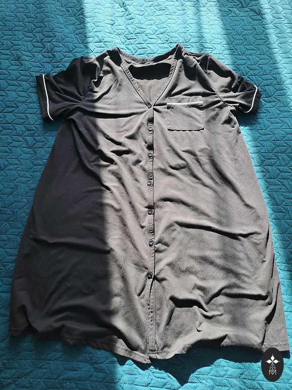 Black, simple dress, very comfortable, with seams on the sides to stretch perfectly with the belly. No defects. Length from shoulder 100 cm.