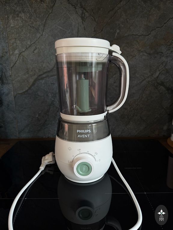 Šaukštai yra nauji, kūdikių prijuostė yra nauja, buteliuko termosas yra naujas. Nuotraukoje matomas šaukšto rankenos defektas.
