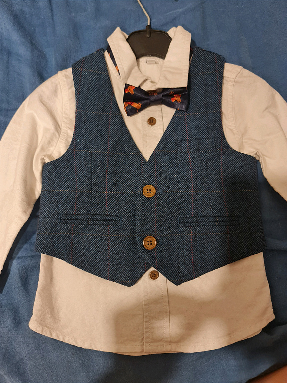 Skaists komplektiņš krekls,vesteun bikses, ļoti labā stāvoklī. 5-6gadi derēs.