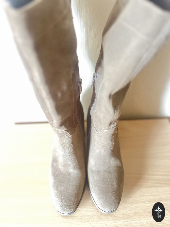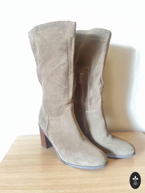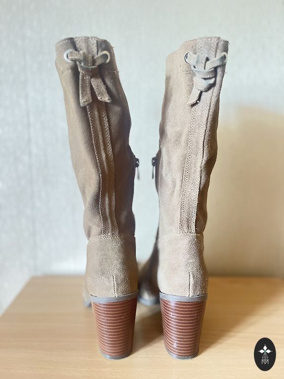Fine suede boots. 10 cm thin heel. Decorative leather strap across the top, tied at the side like a bow. Wearable. No signs of wear on the suede.