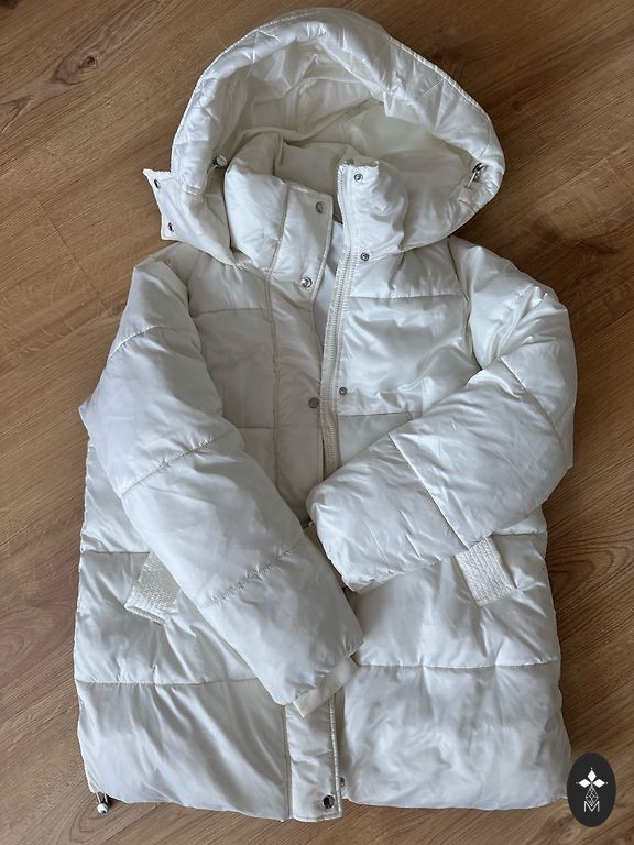 The jacket is 74 cm long, has pockets, and is cinched at the waist. My daughter wore it a few times.