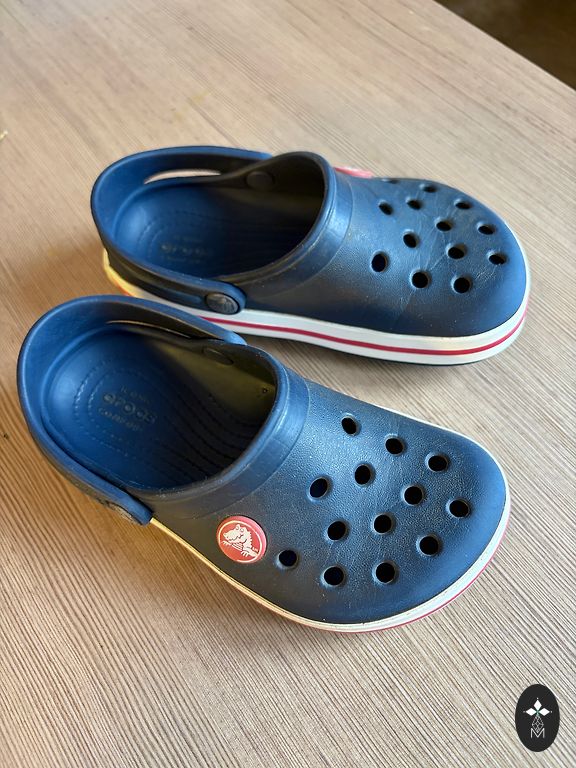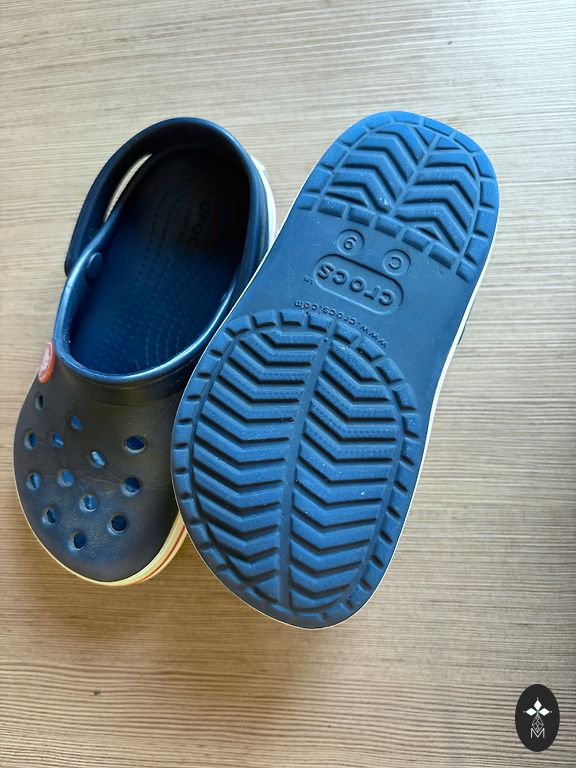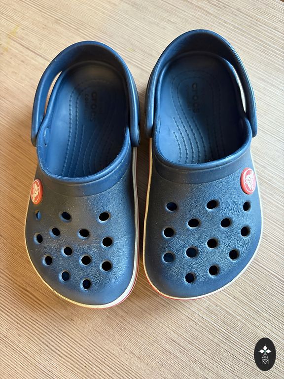 C9 Crocs sandals in good condition. The price is €5 because the child chewed off the labels on both sandals - see the last photo. Located in Riga, Pļavnieki, or I can send them.