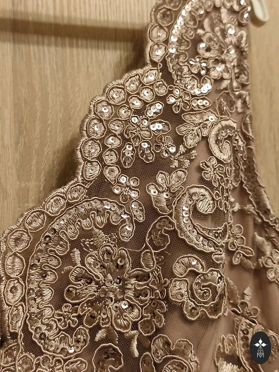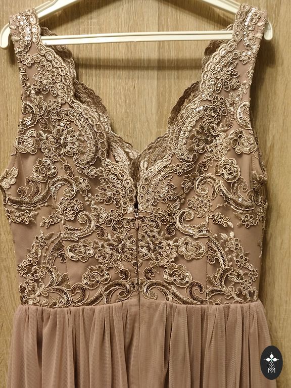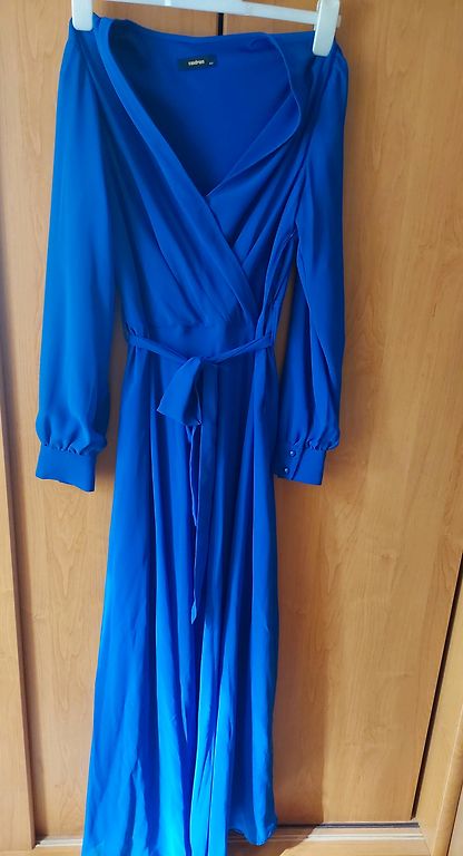 Kleita ar kabatām un smuku jostu. Garums - 160 cm, plecos - 90 cm, no paduses līdz padusei - 106 cm, viduklis - 90 cm. Nav M izmērs, daudz lielāks un uz augumu ne mazāk par 170 cm. Uzvilkta tikai vienu reizi.
