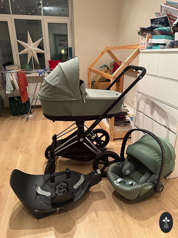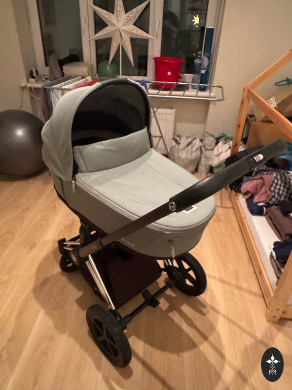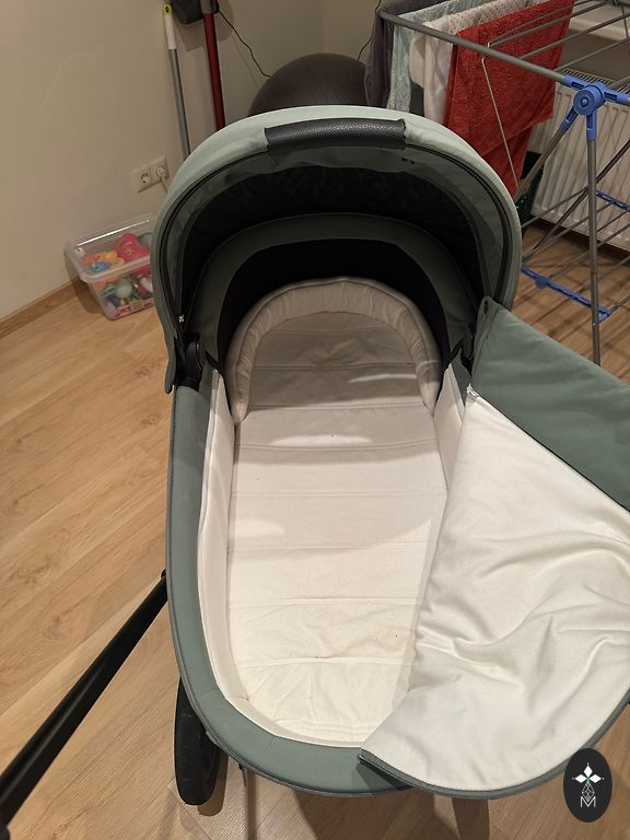 Komplektā: rāmis ar riteņiem, kulba, sēžamā daļa, kāju pārsegs (kulbai un sēžamai daļai), iepirkumu grozs, matracis, lietusplēve, moskīttīkls.
