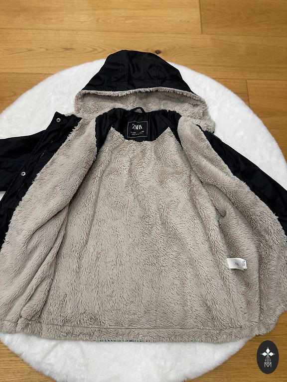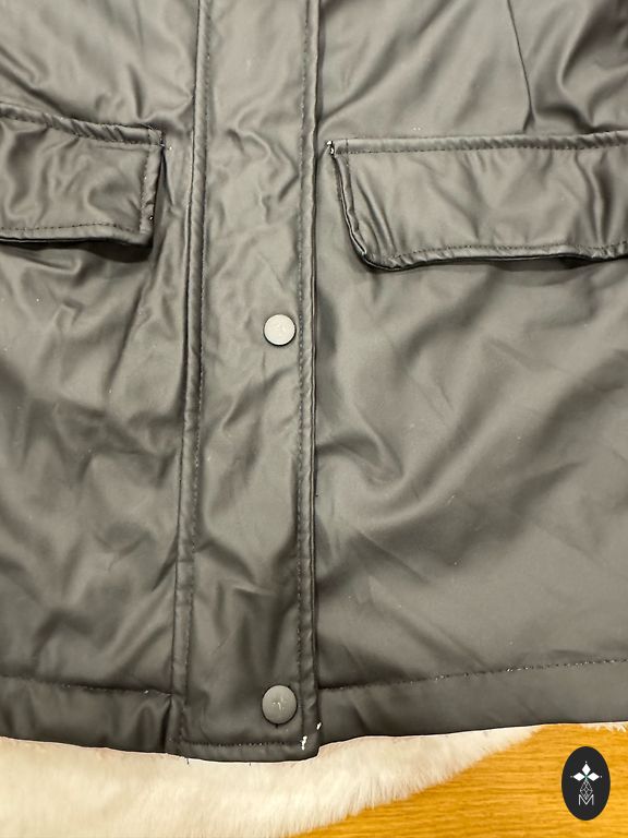 Черный. Размер производителя 176. Отличный вариант в качестве запасного. Есть внешние дефекты. После 2 детей. Носился зимой. Теплый, но не толстый. Ширина в талии 56x2 см. Длина от плеча 72 см. Рукав от плеча 62 см. Под мышками 58 см.