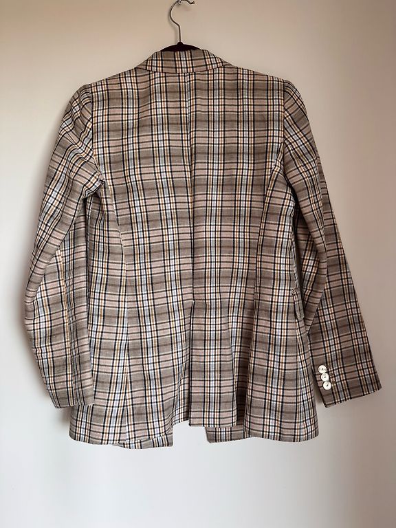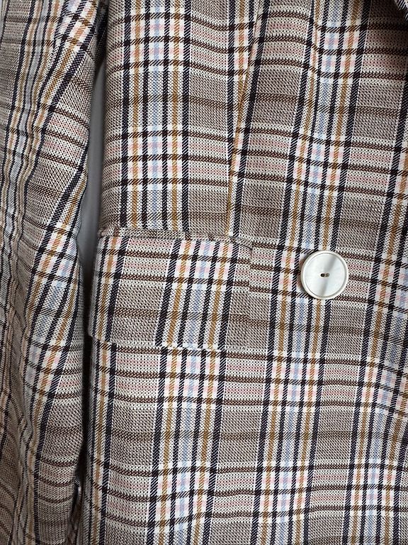 Mišrios medvilnės sudėties, tamsiai mėlyno kostiumo audinio švarkas. Krūtinės plotis 52 cm, ilgis 59 cm. Su pamušalu.