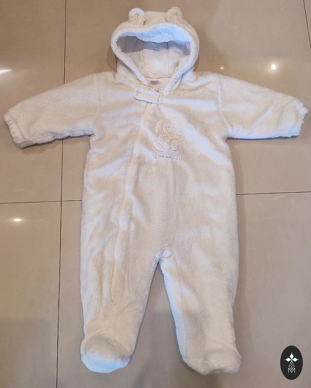 Soft jumpsuit with booties, with pompoms on them.