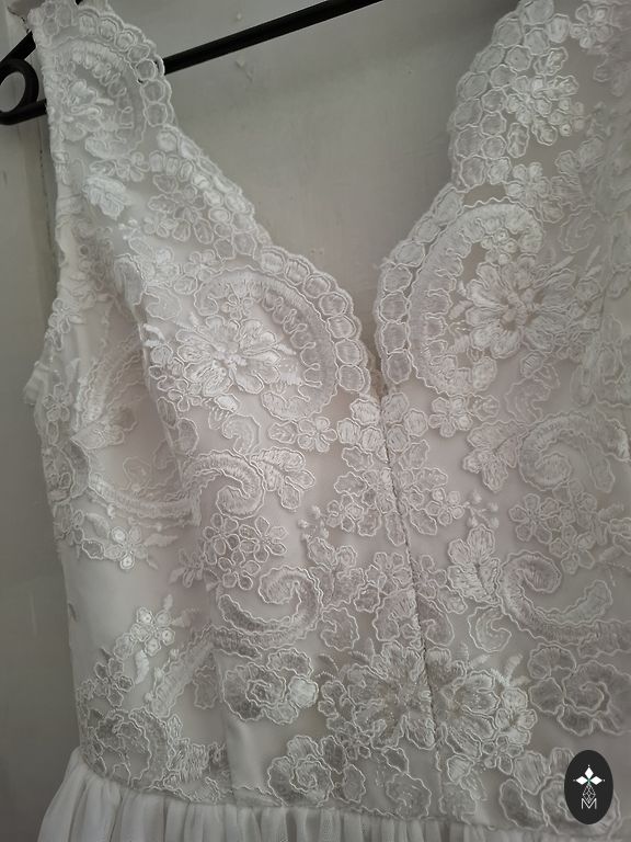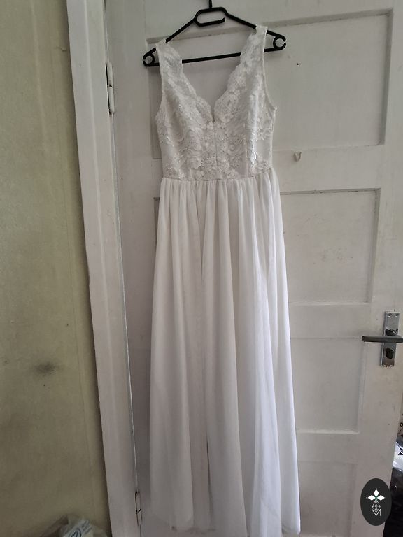 Suknelės bendras ilgis nuo peties yra 109 cm, juosmens apimtis yra 40 cm, krūtinės apimtis yra 45 cm, rankovės ilgis nuo peties yra 58 cm. Dviguba apatinė suknelė, nėriniai.