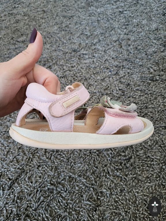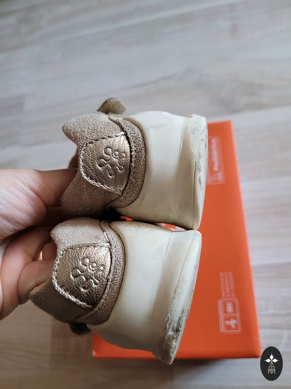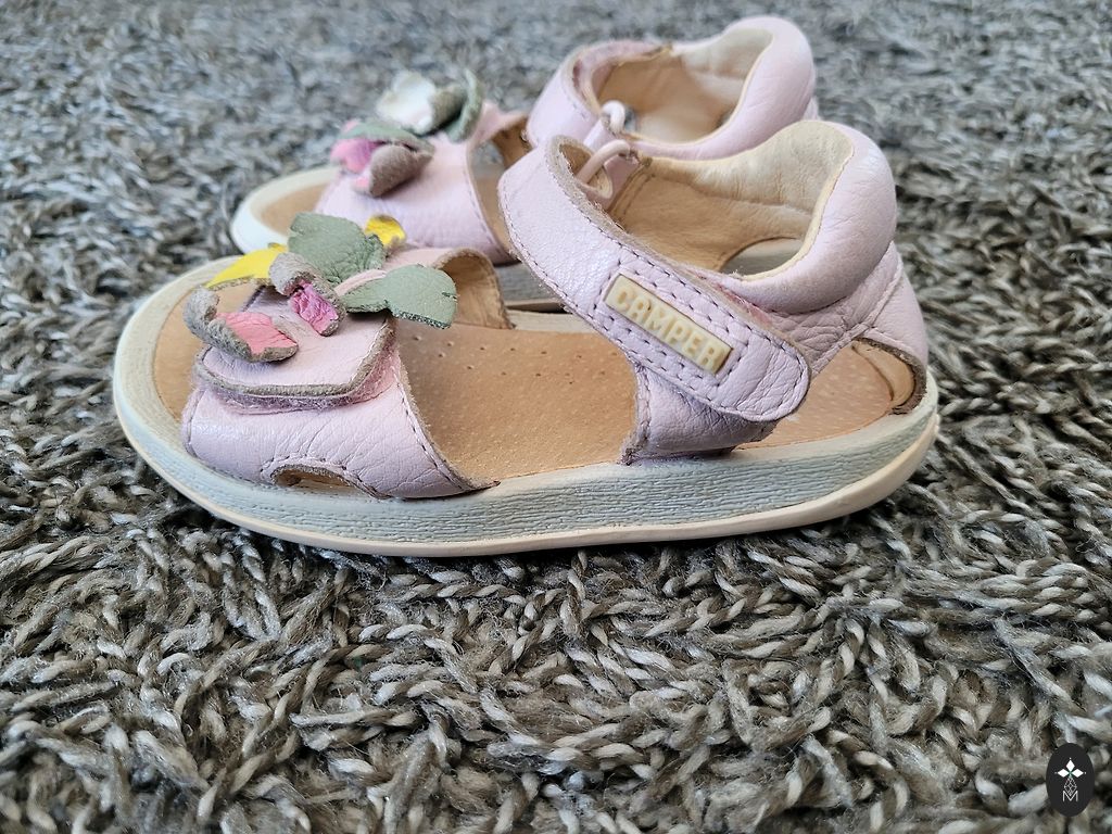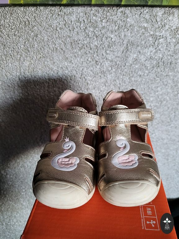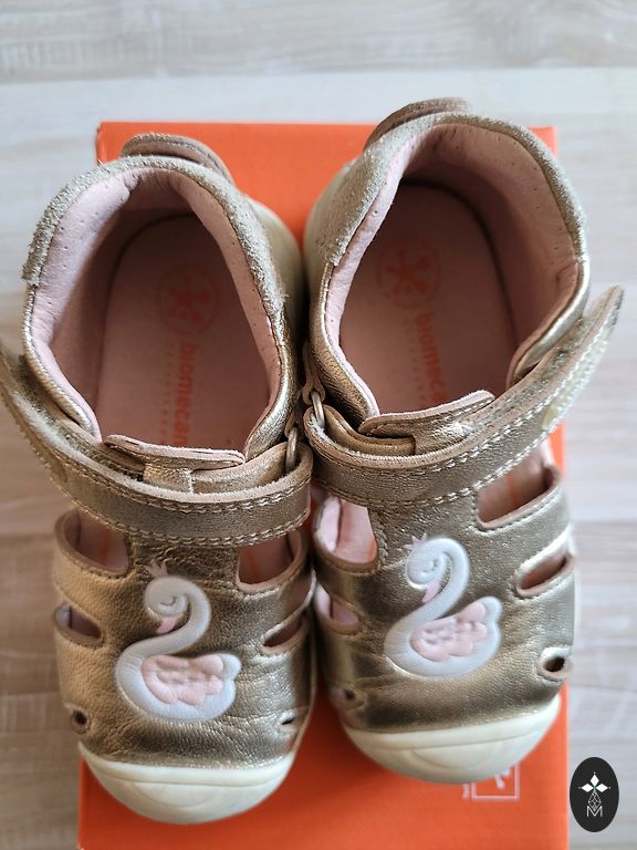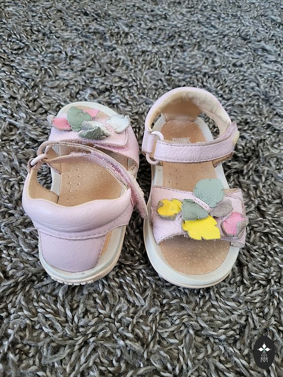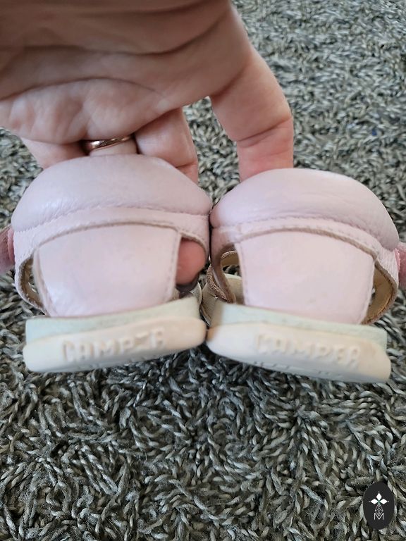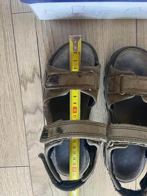 Небольшое черное пятнышко на боковой стороне одной сандалии. Но оно находится не на видном месте. Возможно, его можно удалить.