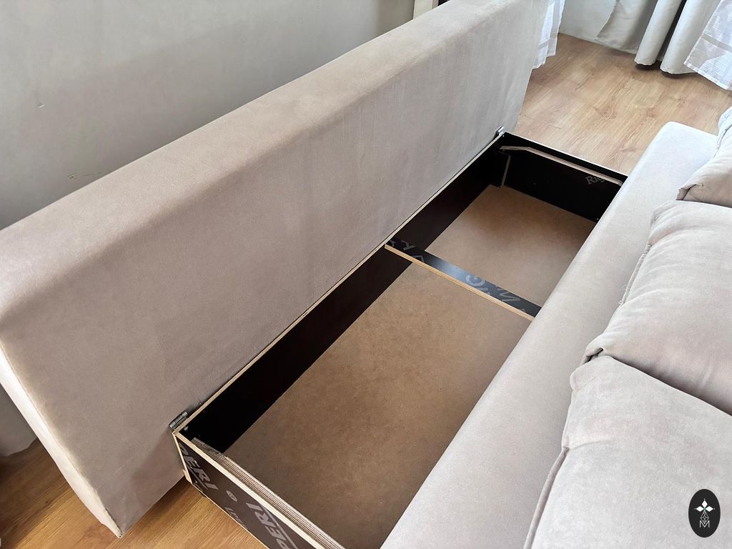 Kampinė sofa, išskleidžiama, su skalbinių dėže