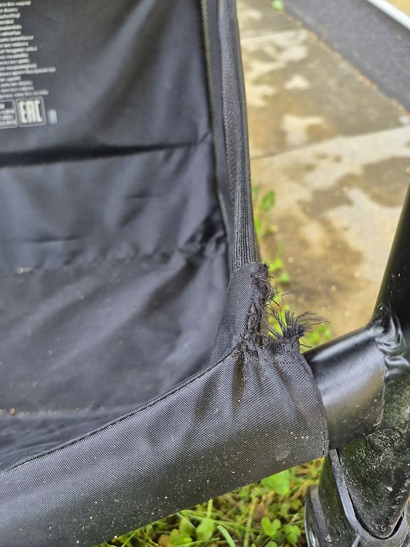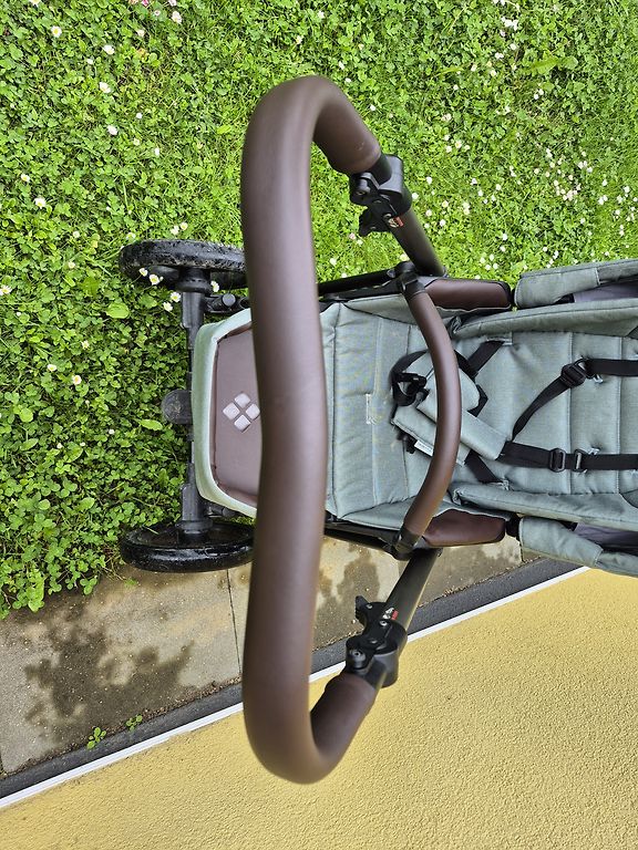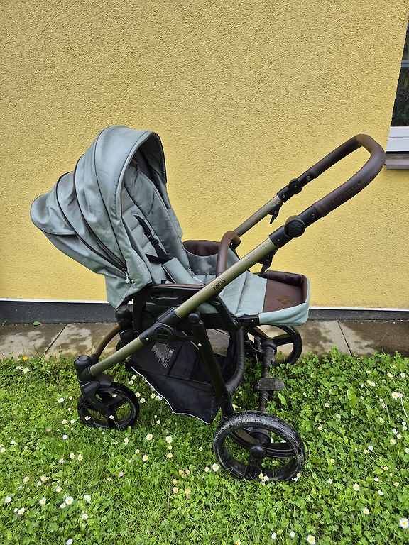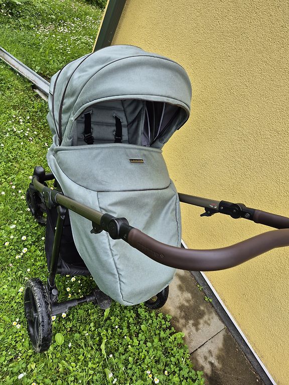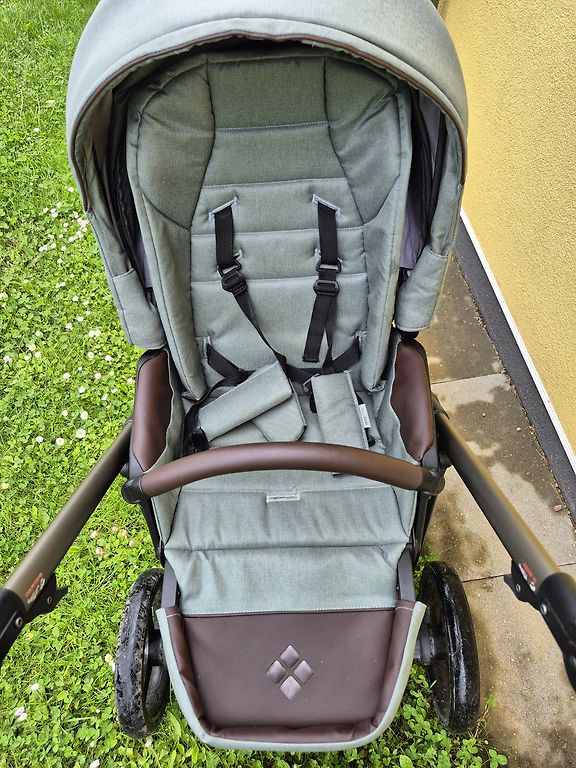 Saudzīgi lietoti vienu gadu vienam bērniņam. Visas auduma daļas ir noņemamas un mazgājamas. Neesam mazgājuši pamata daļu. Papildus piemeklējām un piepirkām lietus plēvi un lielāku moskītu tīklu.