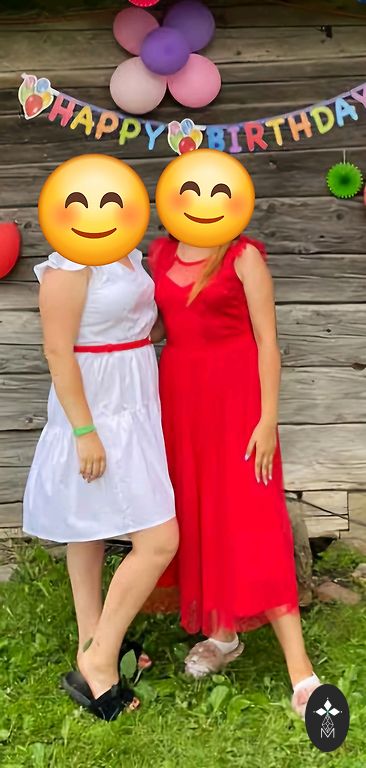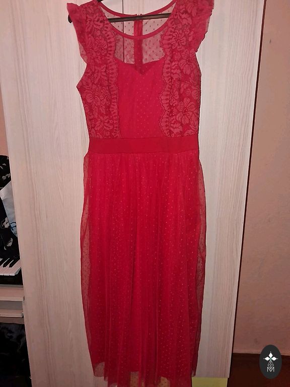 Absolutely unique dress. The dress has an off-shoulder design and slits on both sides at the bottom. Fits sizes 40-46.
