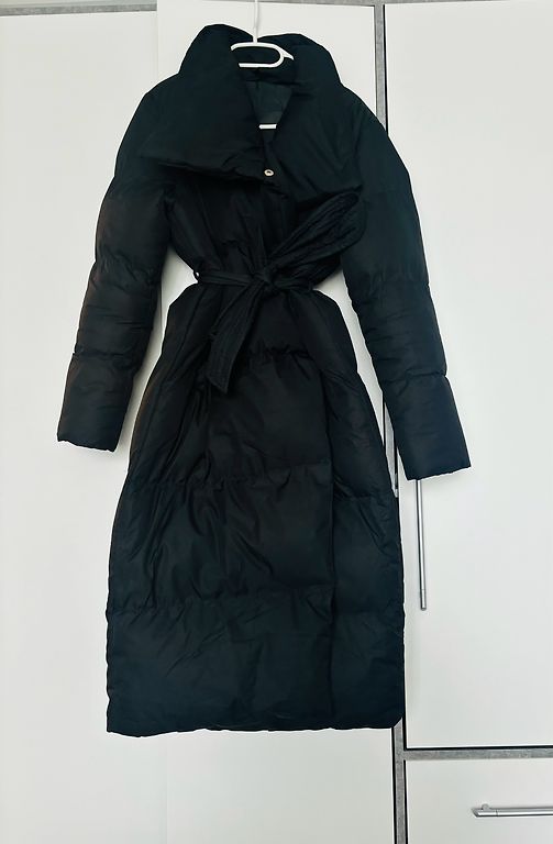 Comes with a belt. Completely black, quilted top, but the bottom and hood + belt are made of wool. Pockets on the outside and one inside on the zipper. Warm coat, can also be worn in winter when it's not too cold.