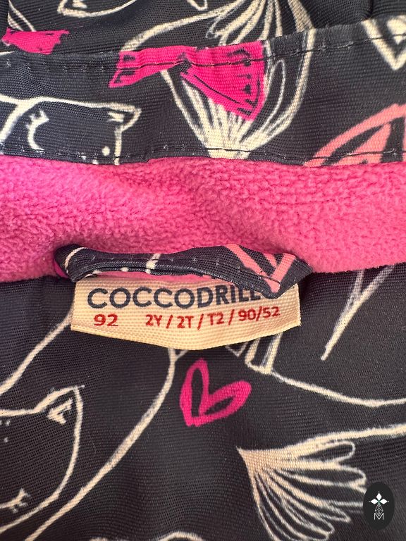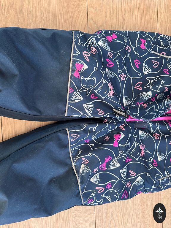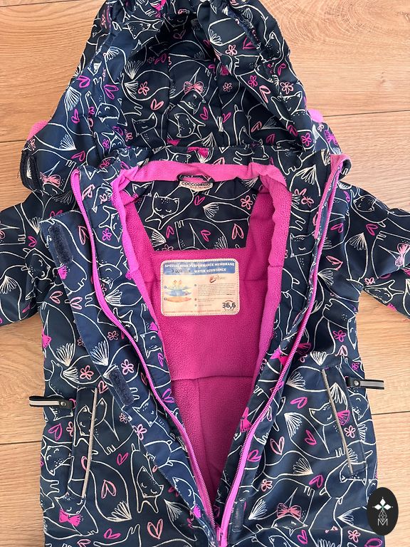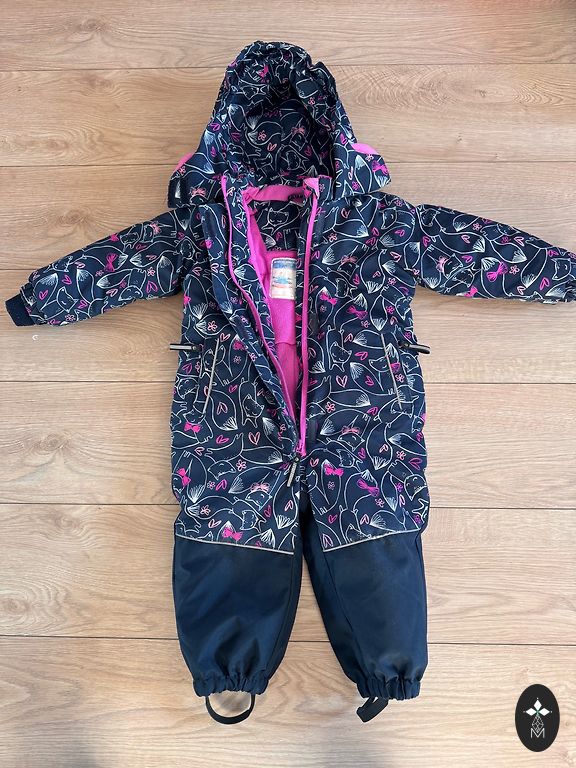 Winter jumpsuit, size 92. There is no rubber on the feet, but new ones can be added as there are studs left. The original zipper pull is missing, but this does not interfere with use.