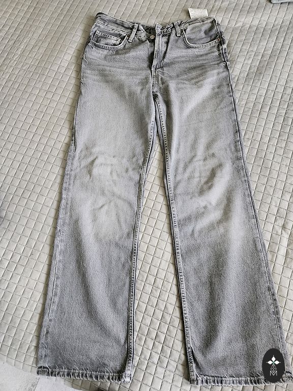 Pilkos spalvos džinsai su įpjovomis, mom fit stiliaus. Ilgis 102 cm.