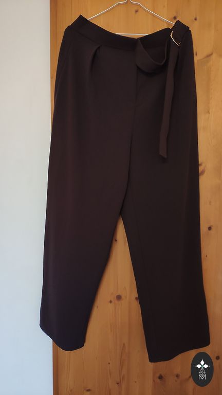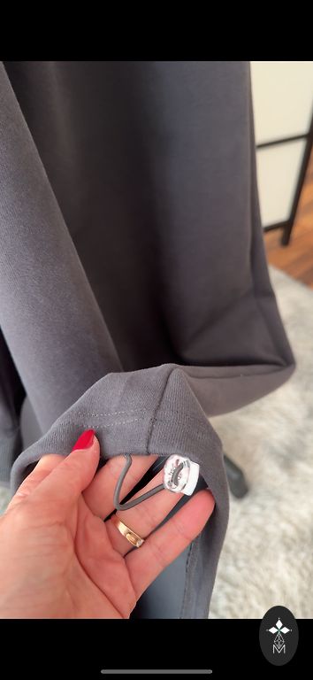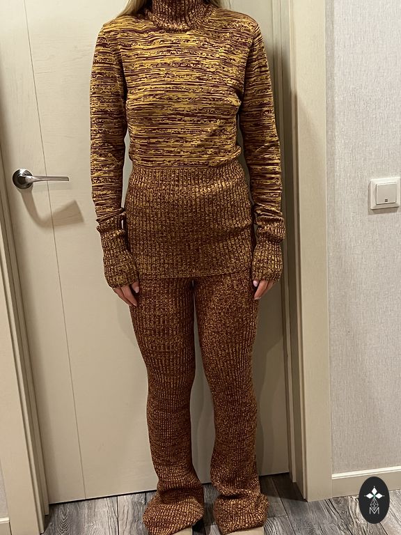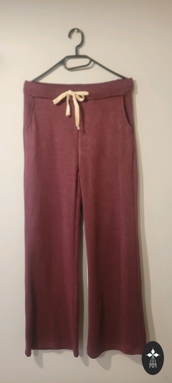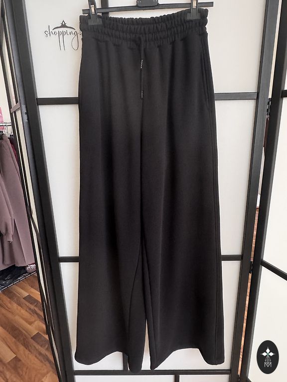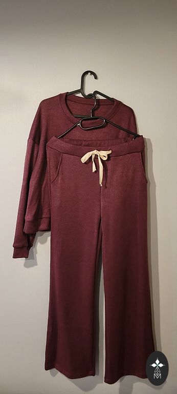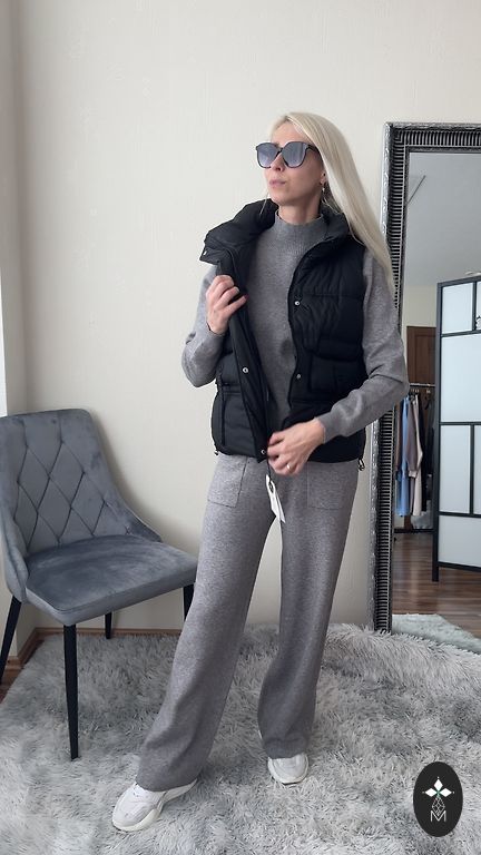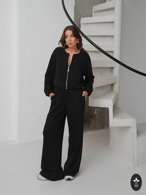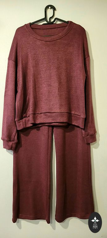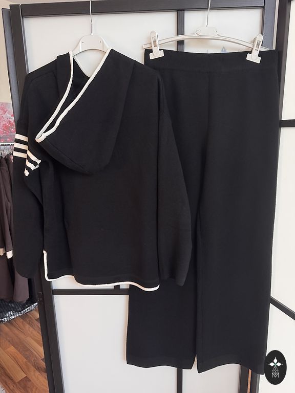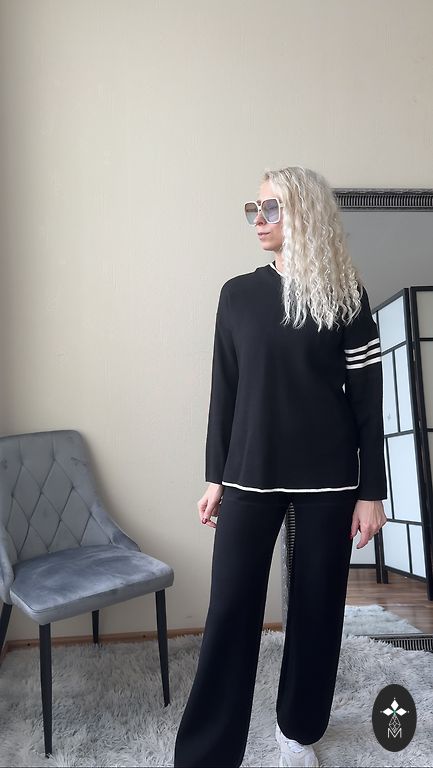 Pehme kangas kerge soojustusega, laia lõikega püksid ja džemper kontrastsete detailidega kaela ja varrukate juures.