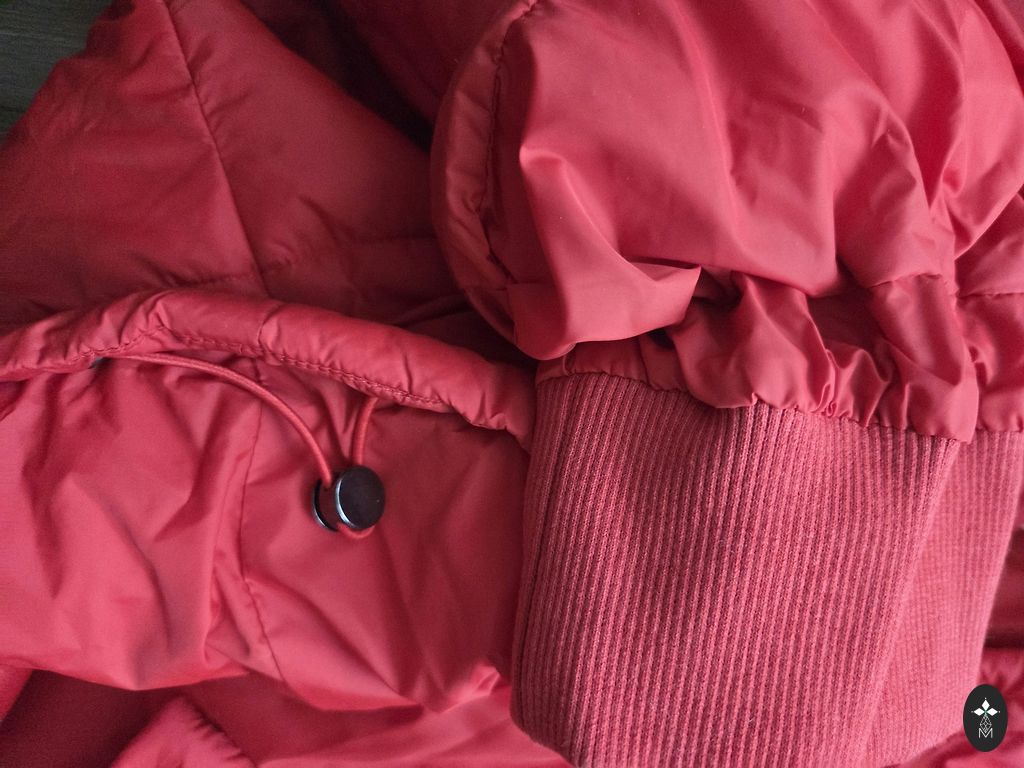 Women's down jacket PrimaLoft Black Eco in red color. Chest area 47x2 cm. Length 61 cm. Sleeve length from armpits 52 cm. Lightweight.