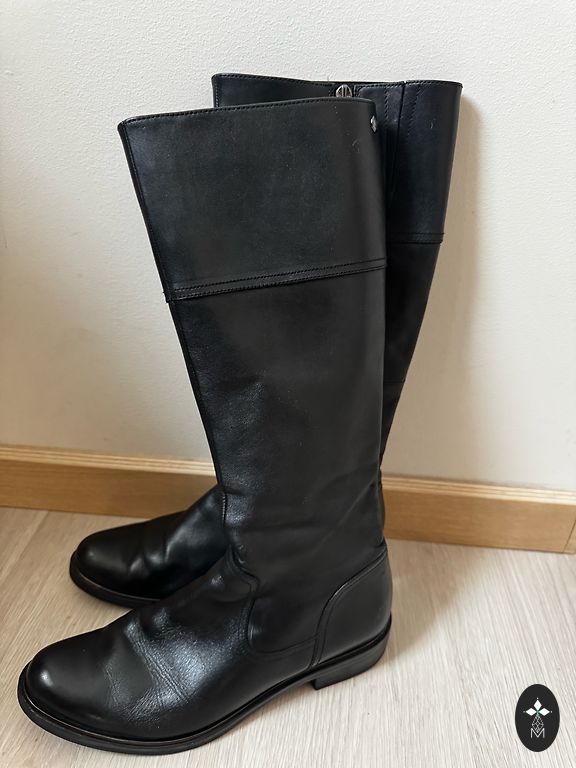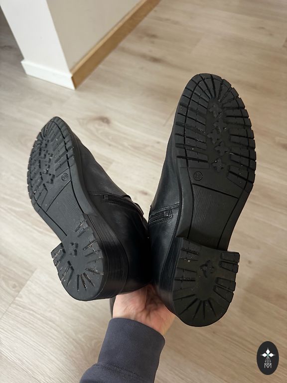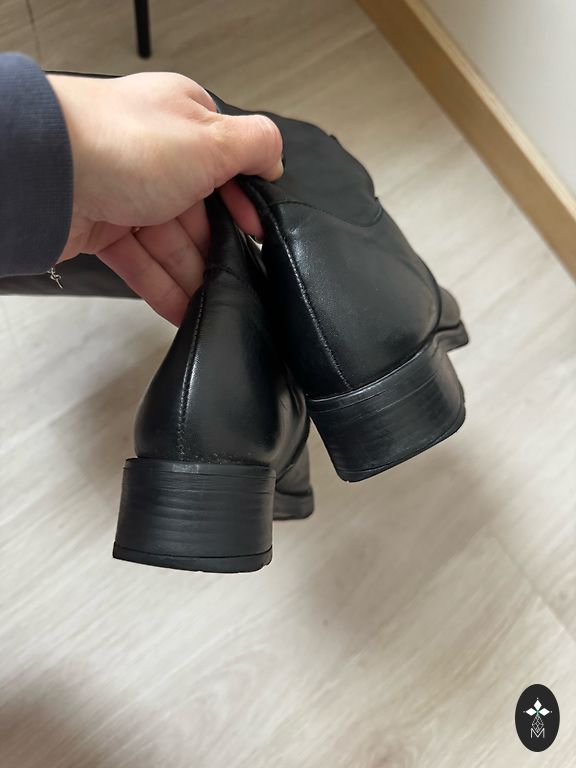 Worn a little - about a week, but still too wide for my foot. Leather. Dark brown color. Total height - about 35cm (around the middle of the calf). Perfect for autumn/spring season. Stylish, elegant.