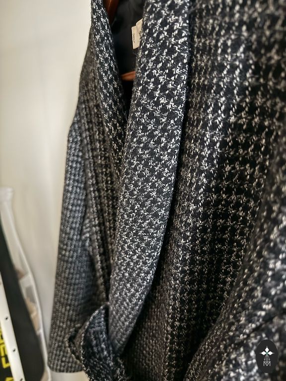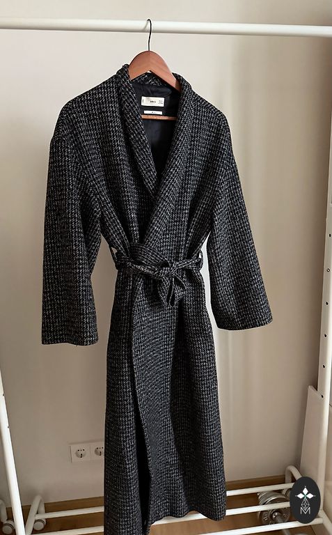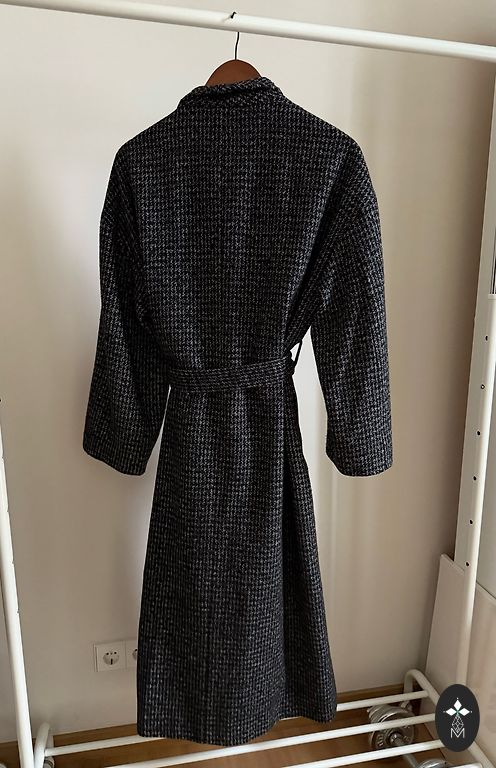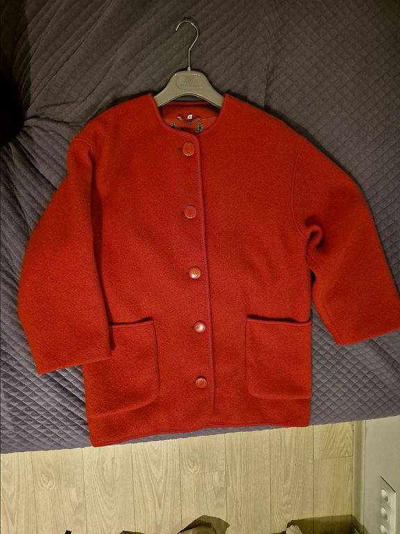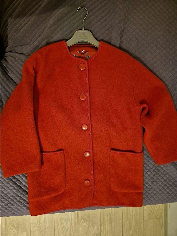 Стильное, качественное пальто. Прямой крой, застежка на пуговицах. Без подкладки. Внутри очень красивое отделочное решение – белая лента. Состав: 80% шерсть-лана верджине. Материал выглядит как бархат. Очень уютное, как халатик. Итальянский размер-44, длина-106 см, подмышками -55 см.
