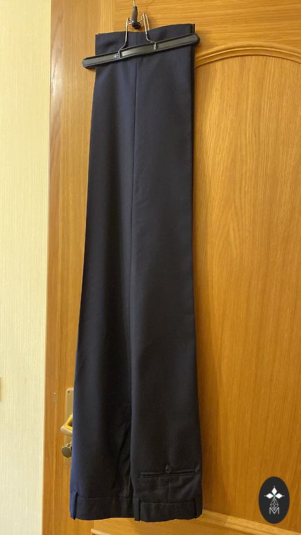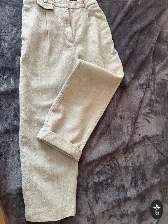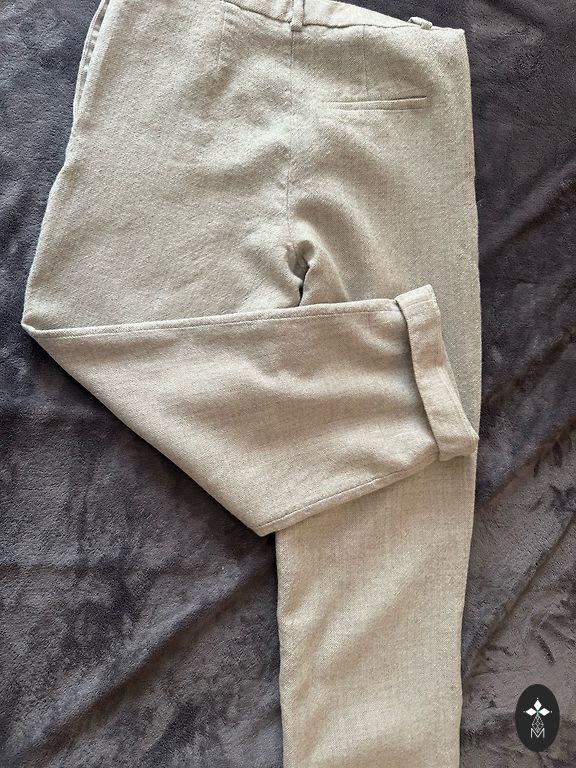 Офисные брюки из шерстяной ткани размера 38 (могут подойти и носительнице размера 40) с подкладкой, длина брюк от пояса 97-98 см, талия (41-42) *2 см, ширина штанины 19,5 см.