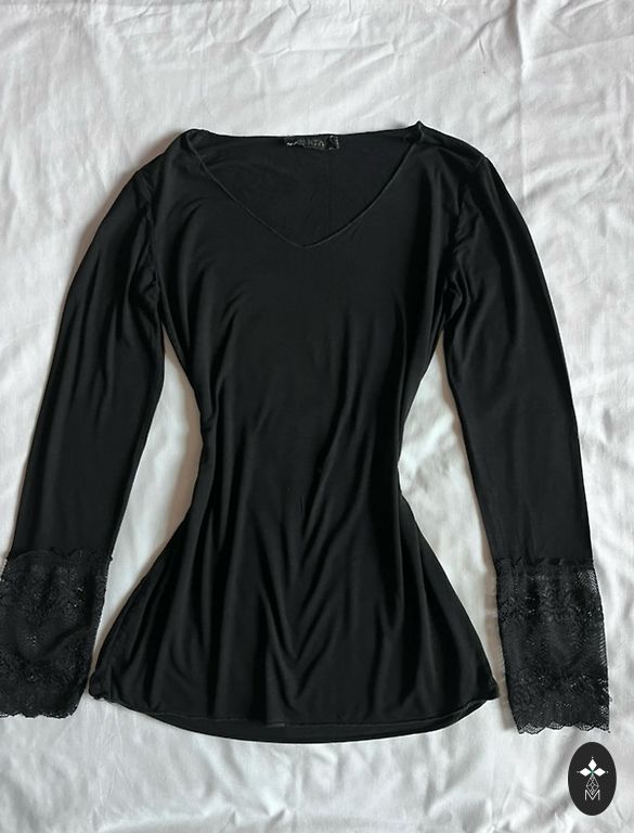 Patīkams krekls ar dekoratīvu mežģīni rokās. Izmērs uz birkas S/M