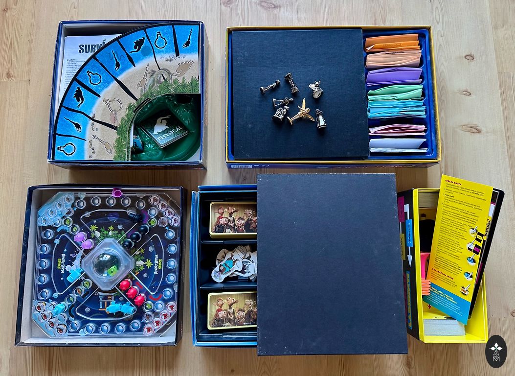 Players place colorful sticks into a wooden trunk and pour monkeys inside. Each player rolls a die, which determines the color of sticks they must pull from the trunk. If a monkey falls out when pulling a colorful stick, the player takes that monkey as minus points. The winner is the one with the fewest minus points at the end of the game.