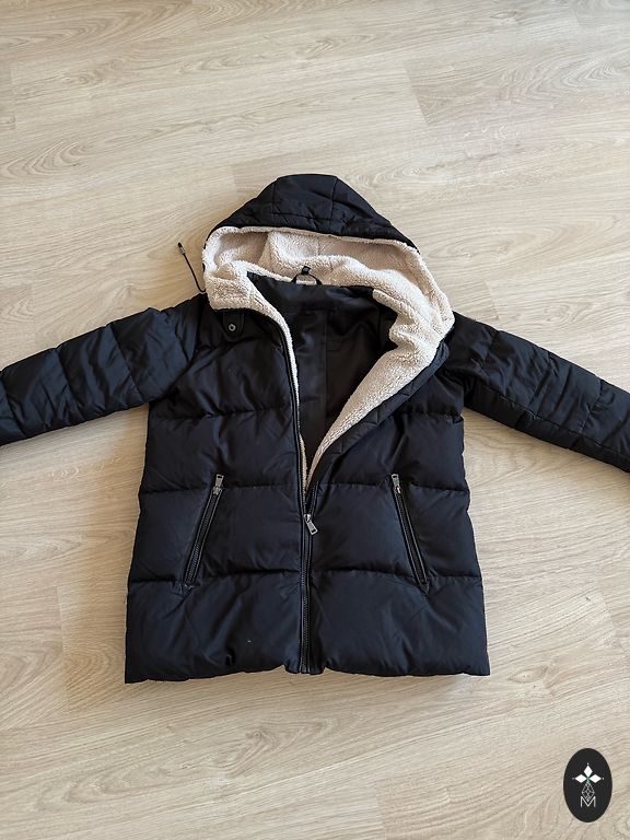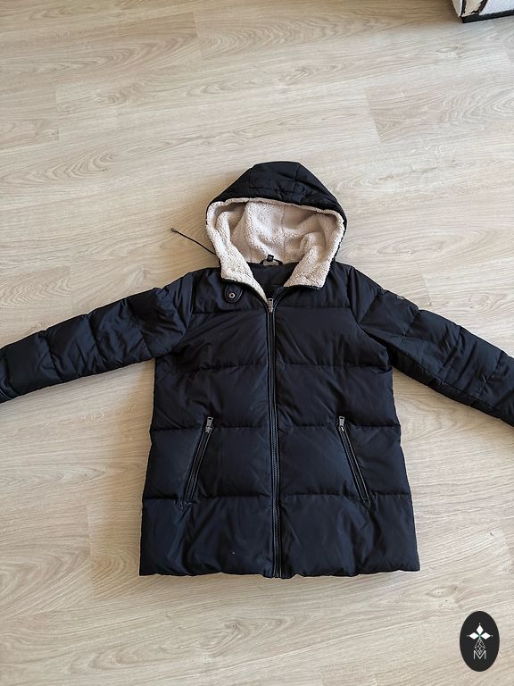 Ski down jacket with a luxurious raccoon collar, size S.