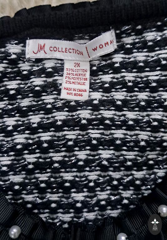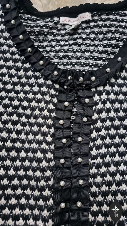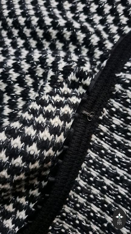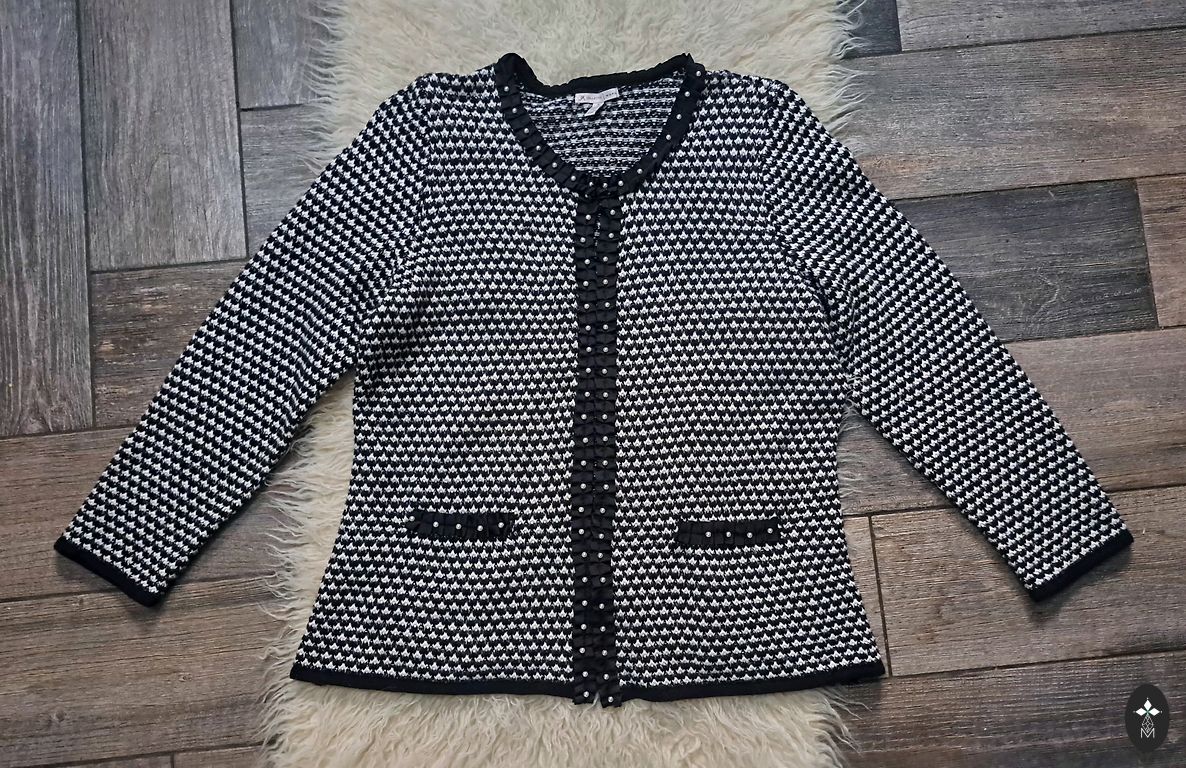 The Kooples juodas, trumpas švarkas su dekoratyviniu nėriniu pamušalu ir tekstūruotu išore. Ilgis 47 cm, rankovių ilgis 51 cm.