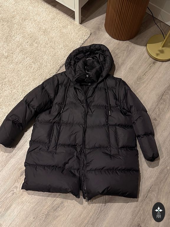 Šauni pūkinė striukė rudeniui, šiltai žiemai, lengva. Tokio oversize tipo, su nuleista pečių linija. Tiks S/M mažam L, bet žiūrėkite matmenis.