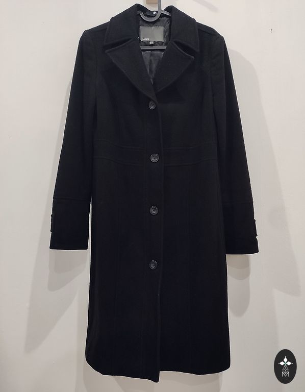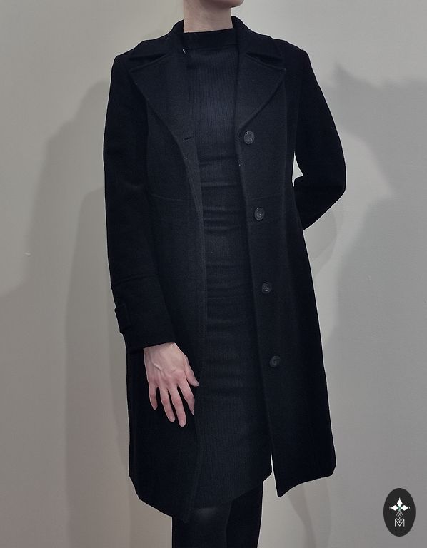 Elisabeth Shannon per didelis, juodas, pusiau ilgas lietpaltis.