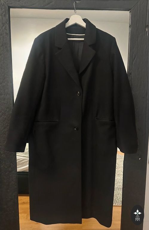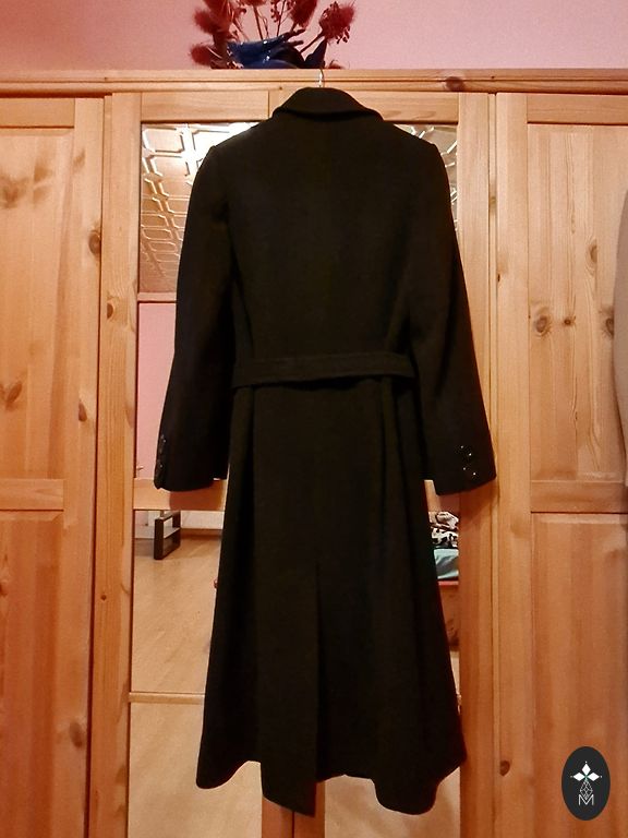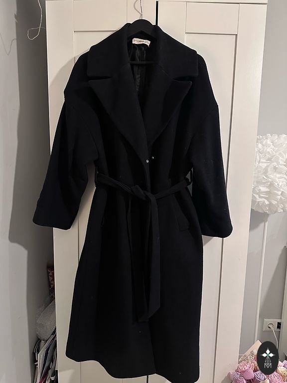 Ļoti labs, mīksts, silts mētelis. Sastāvā 74% vilna. Esmu M izmēra un man ir nedaudz pa lielu. Garums 117cm, krūšu platums 60cm. Taisna piegriezuma, aizveras ar slēptām kniedēm.